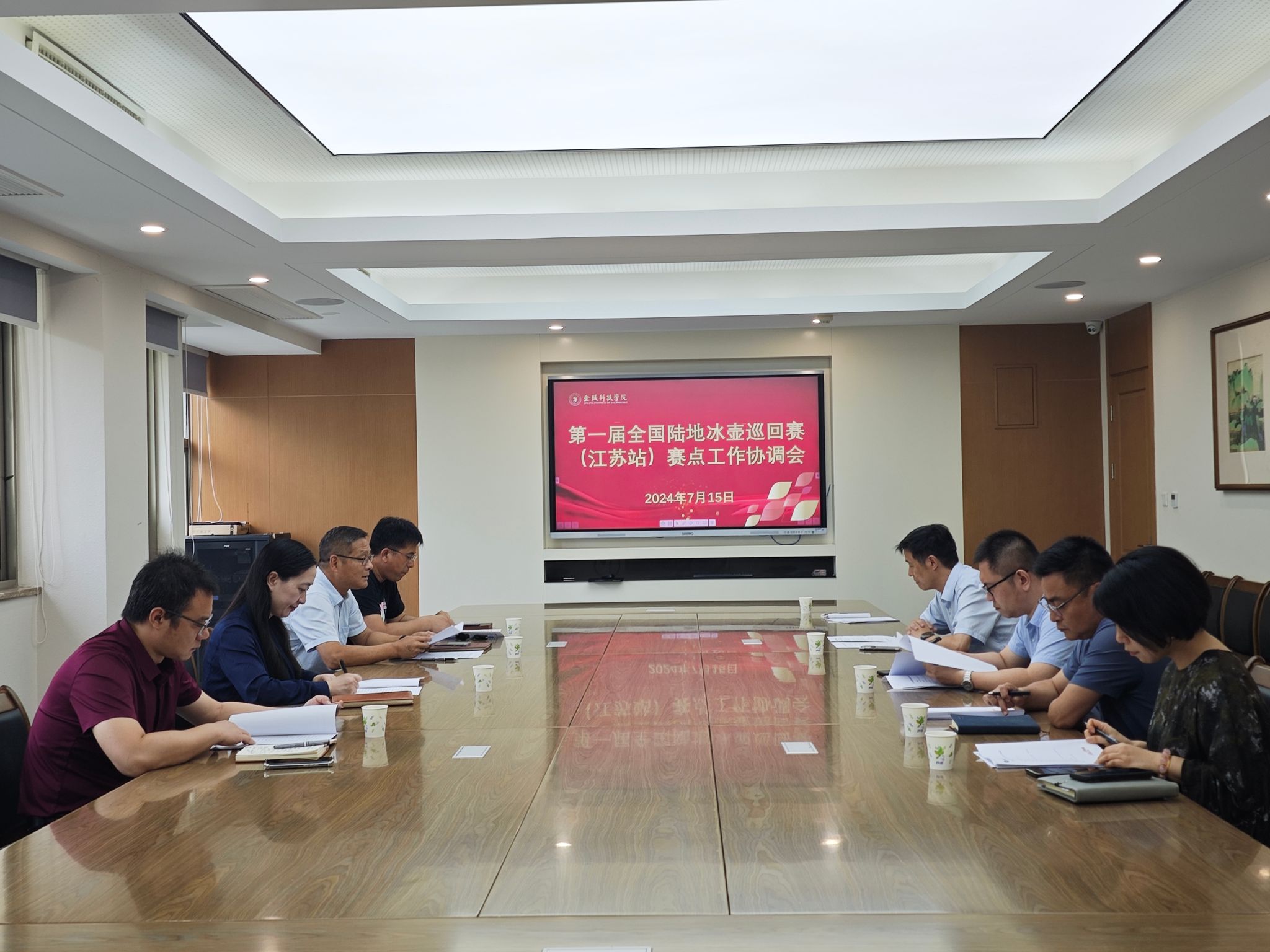 7月15日上午,beat365召开第一届全国陆地冰壶巡回赛(江苏站)赛点工作协调会,副校长顾晓燕主持并讲话,保卫处、后勤管理处、后勤实业总公司、团委等部门主要负责人及体育部相关人员参加。
