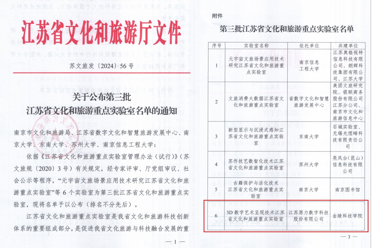 近日,江苏省文化和旅游厅公布了第三批江苏省文化和旅游重点实验室认定名单,beat365作为共建单位和江苏原力数字科技股份有限公司共同申报的“3D数字艺术呈现技术江苏省文化和旅游重点实验室”成功获批,是此次获认定的6家单位之一。