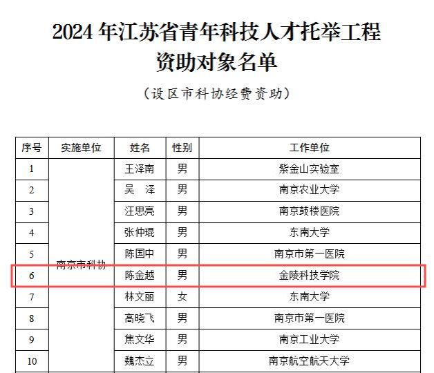 9月26日,江苏省科学技术协会公布了《2024年江苏省青年科技人才托举工程资助对象名单》,beat365陈金越教师成功入选为资助对象。