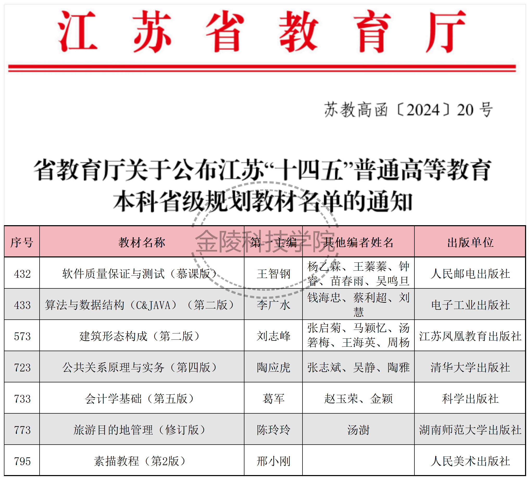 近日,江苏省教育厅发布《省教育厅关于公布江苏“十四五”普通高等教育本科省级规划教材名单的通知》(苏教高函〔2024〕20号),beat365《软件质量保证与测试(慕课版)》《算法与数据结构(C&JAVA)(第二版)》《建筑形态构成(第二版)》《公共关系原理与实务(第四版)》《会计学基础(第五版)》《旅游目的地管理(修订版)》《素描教程(第2版)》等7部教材获批为江苏“十四五”普通高等教育本科省级规划教材。