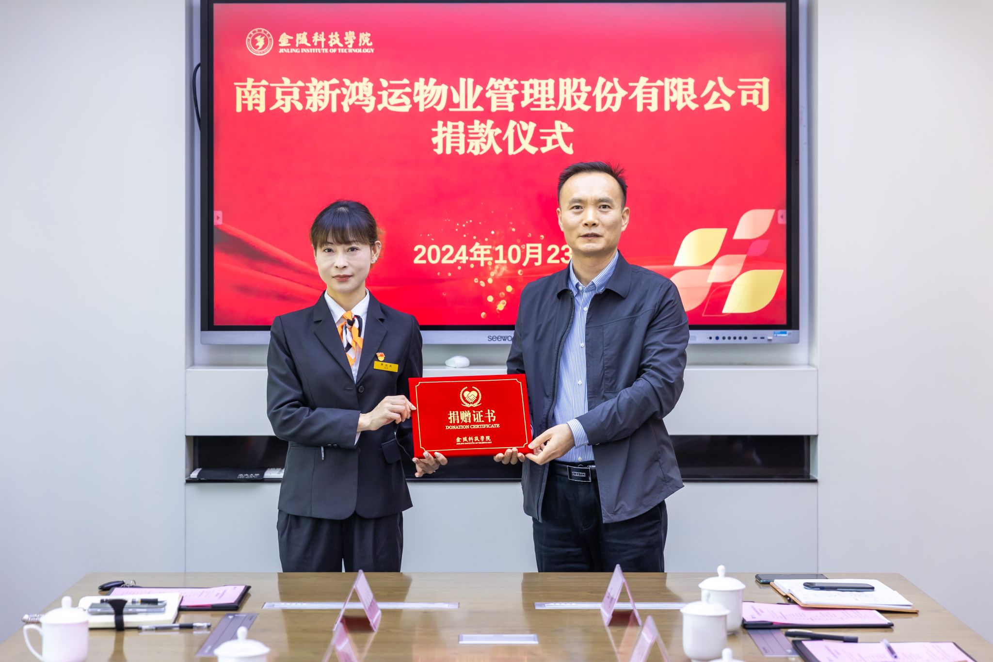 刘永彪向新鸿运公司连续四年对学校教育事业的大力支持和慷慨捐赠表示衷心感谢。他表示,学校将切实做好捐赠资金的使用规划,把企业捐款用到实处。他希望新鸿运公司坚持以优化校园物业服务为导向,继续助力学校工作,为学校高质量发展提供优质后勤保障。