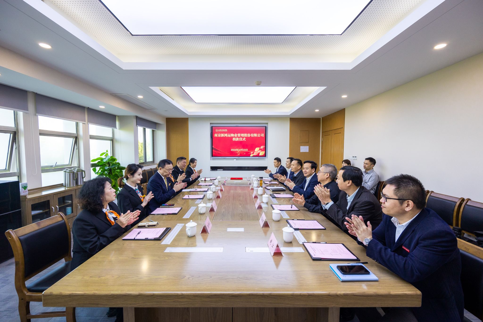 10月23日上午,南京新鸿运物业管理股份有限公司捐款活动在江宁校区行政楼会议室举行。新鸿运公司董事长王中宁、副总经理徐敏及培训部负责人和项目经理,beat365校长刘永彪、副校长高永祥、副校长王延光及校长办公室、后勤管理处、后勤实业总公司及教育发展基金会负责人参加捐款活动。活动由王延光主持。