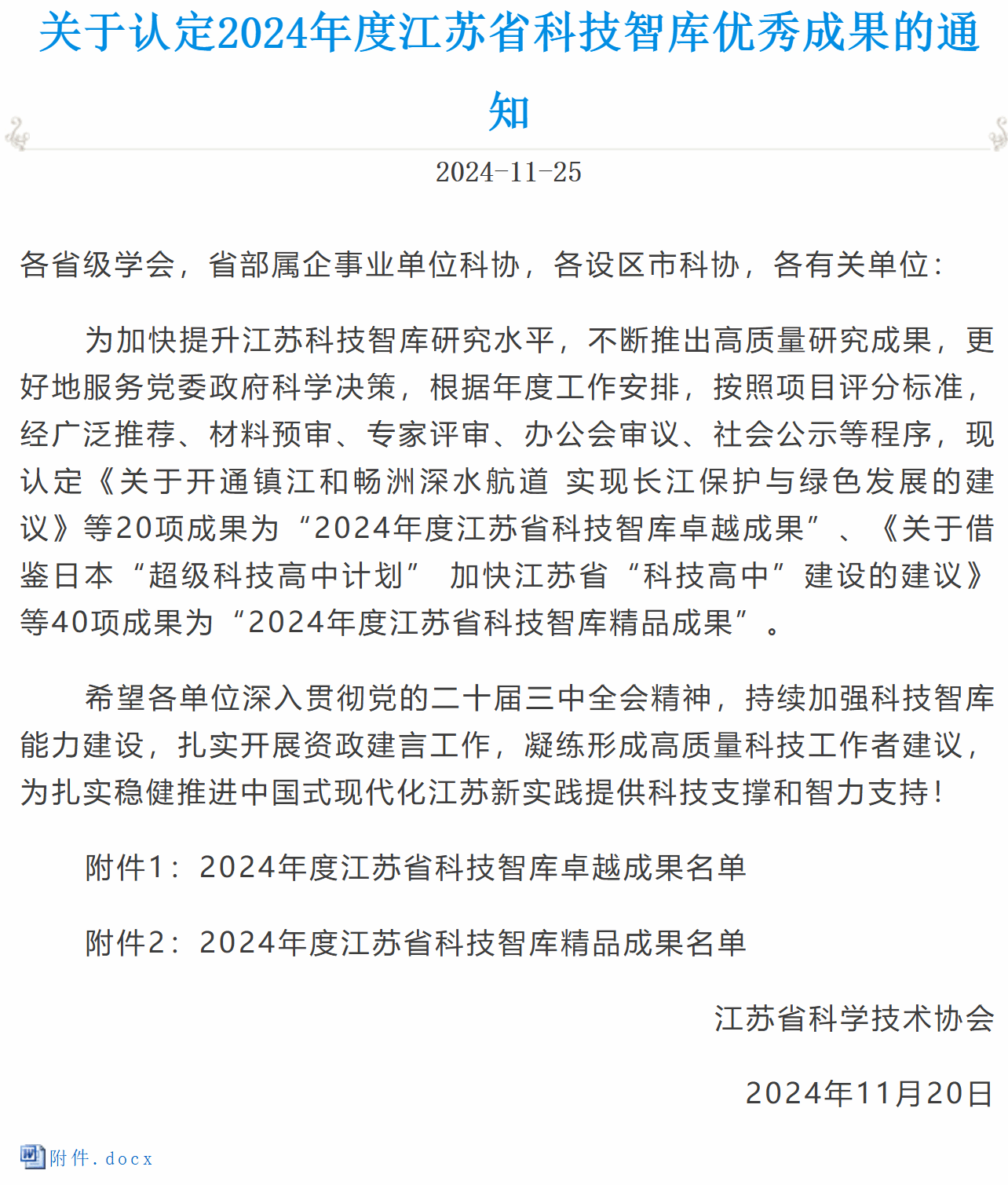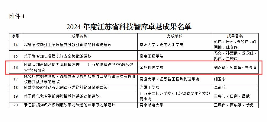 11月20日,江苏省科学技术协会发布《关于认定2024年度江苏省科技智库优秀成果的通知》。beat365刘永彪教授、李忠海副教授、陈浩博博士撰写的《以数实加速融合助力高质量发展——江苏加快建设“数实融合强省”战略研究》决策咨询报告,被认定为“2024年度江苏省科技智库卓越成果(省一等奖)”。这既是beat365首次获评江苏省科技智库卓越成果奖项,也是beat365数字经济团队组建以来第六次获评省、市级优秀智库成果奖项。此次评选活动在全省范围内开展,经广泛推荐、材料预审、专家评审、办公会审议等环节,最终认定60项优秀成果。其中,卓越成果20项、精品成果40项。