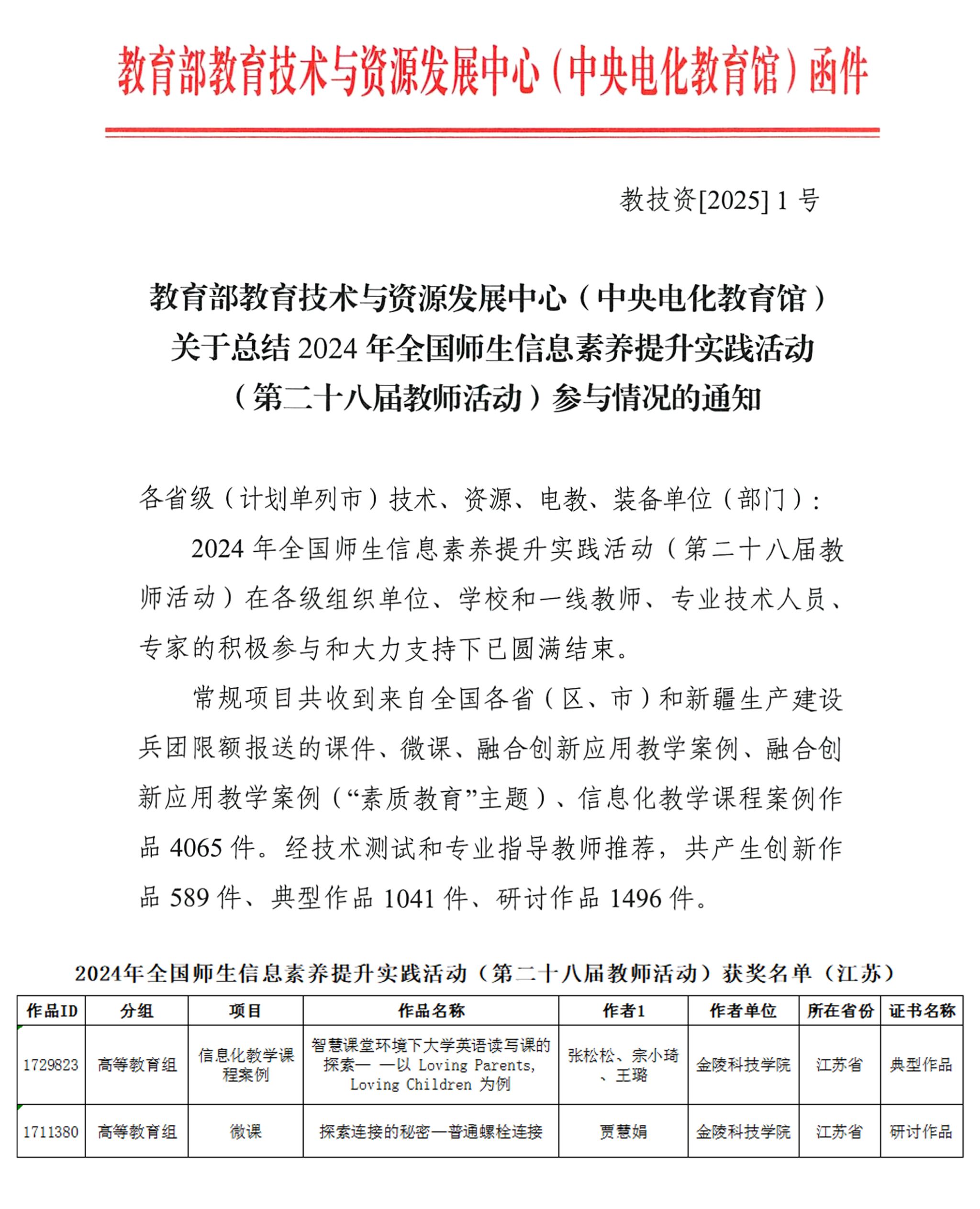 近日,教育部教育技术与资源发展中心(中央电化教育馆)发布《关于总结2024年全国师生信息素养提升实践活动(第二十八届教师活动)参与情况的通知》(教技资〔2025〕1号),beat365两项作品在活动中荣获佳绩,《智慧课堂环境下大学英语读写课的探索——以Loving Parents , Loving Children为例》信息化教学课程案例被评为“典型作品”,《探索连接的秘密—普通螺栓连接》微课被评为“研讨作品”。