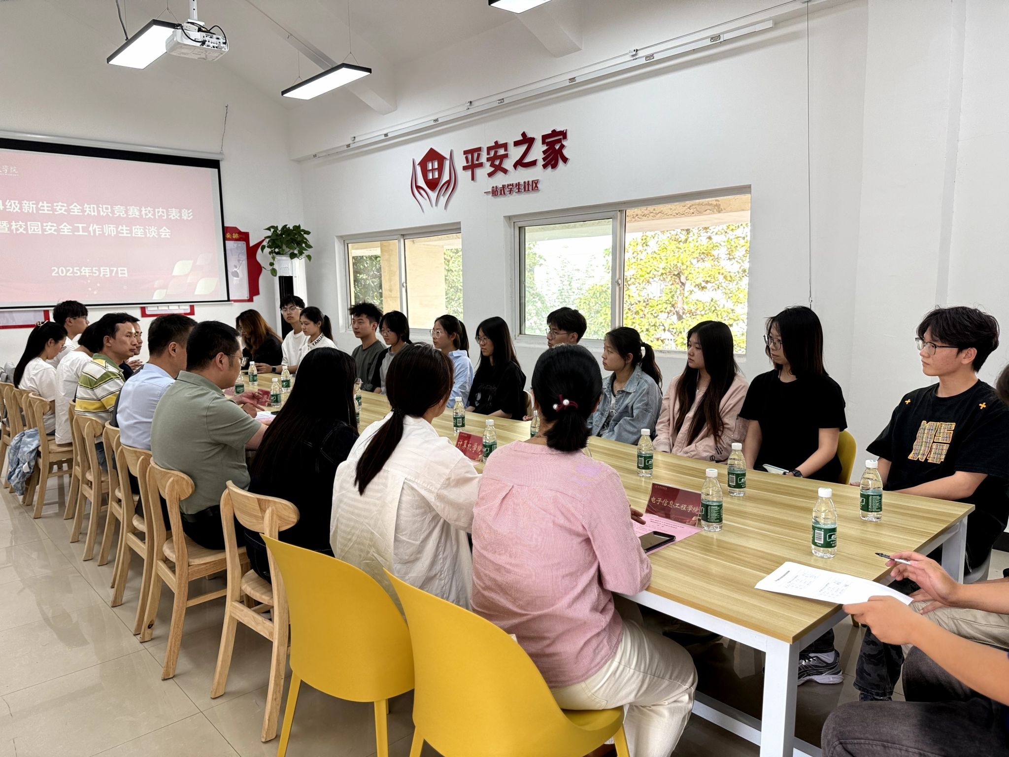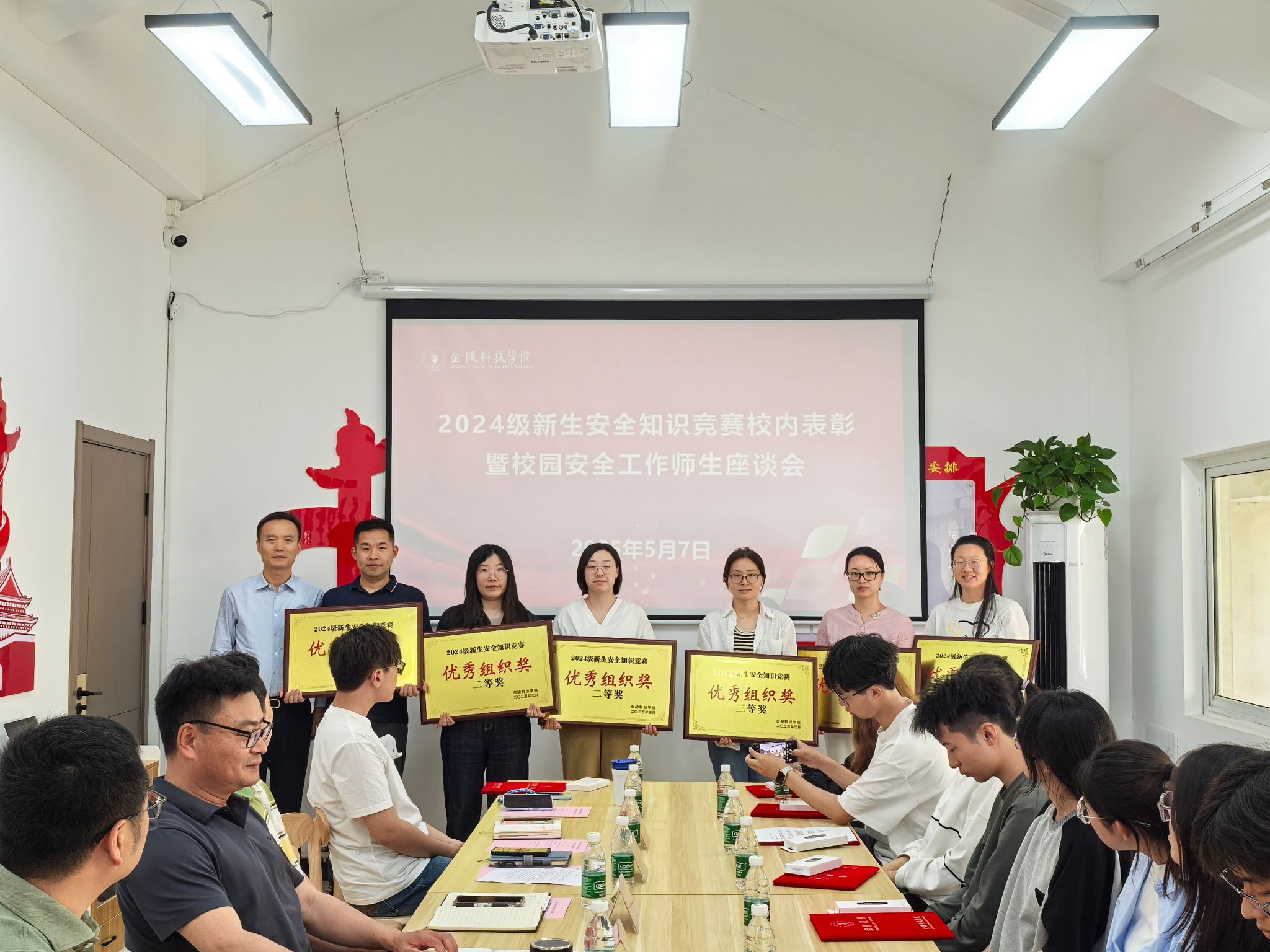 5月7日,beat365在江宁校区南区07栋一站式平安社区举行2024级学生安全知识竞赛校内表彰暨校园安全工作师生座谈会。副校长王延光出席并讲话,获奖单位及个人代表,学生工作处、保卫处负责人参加座谈。