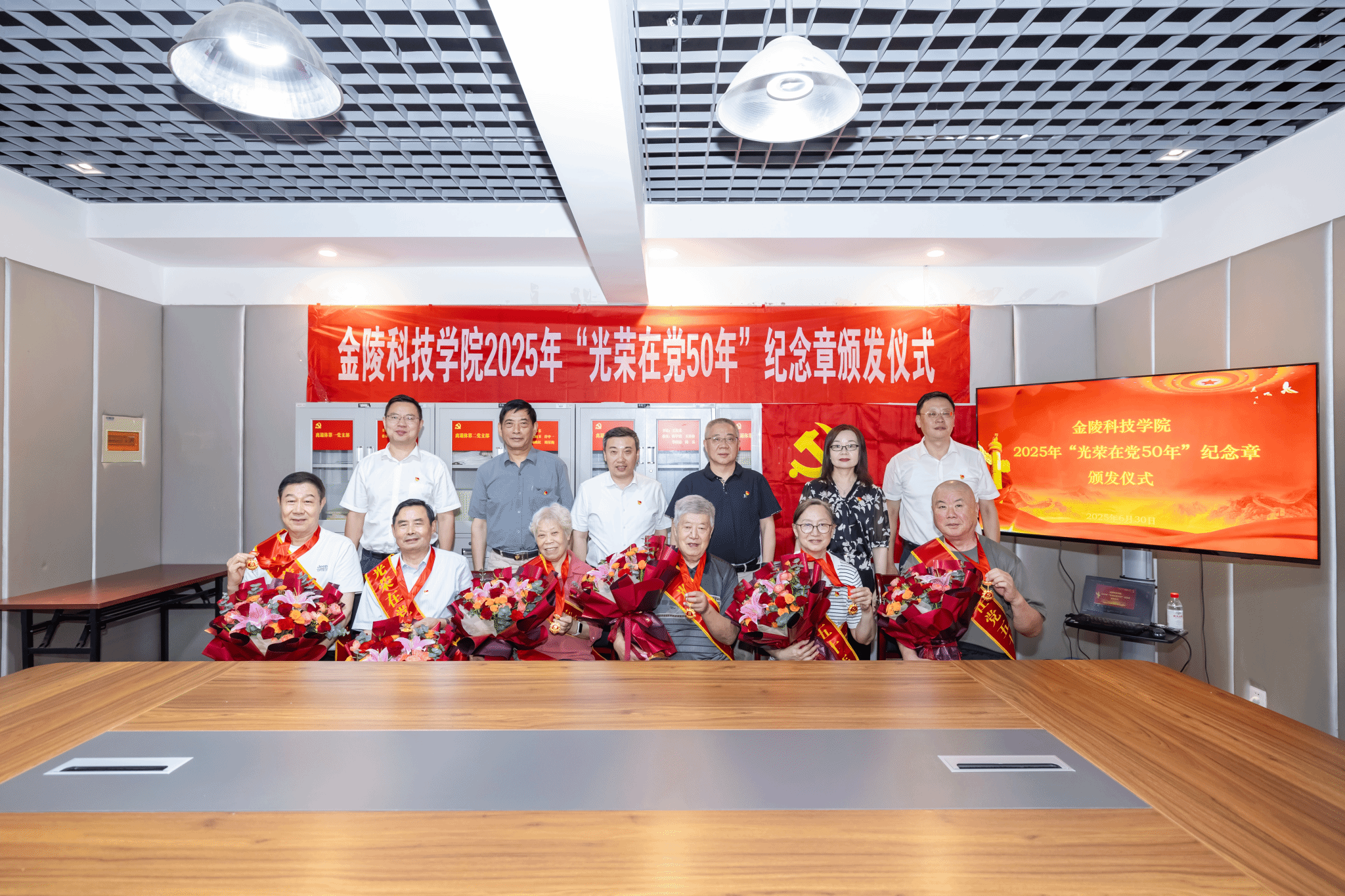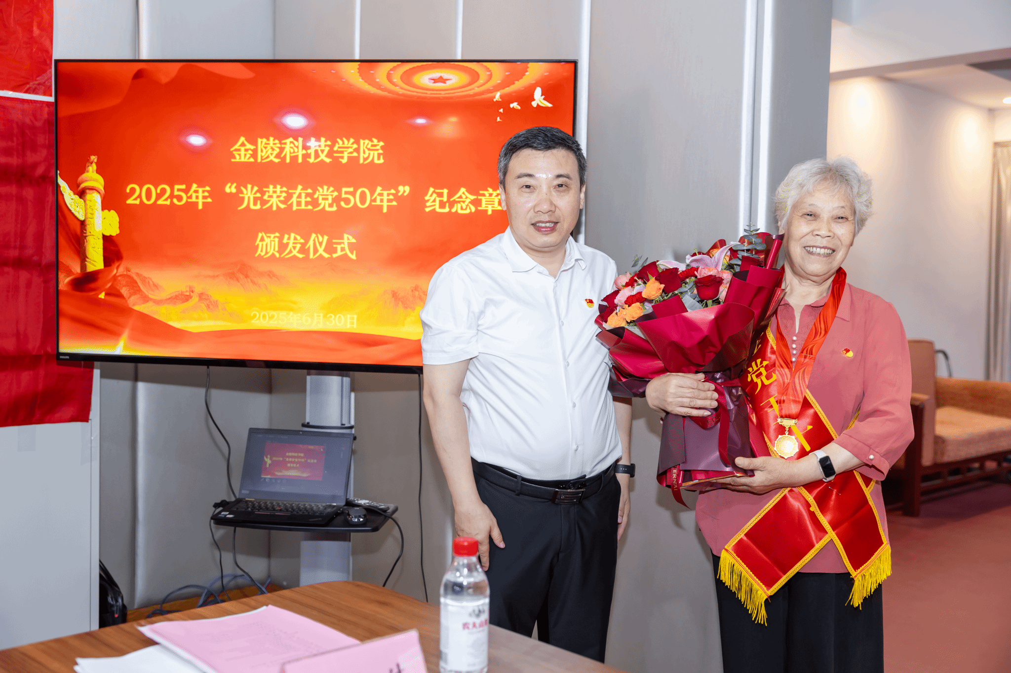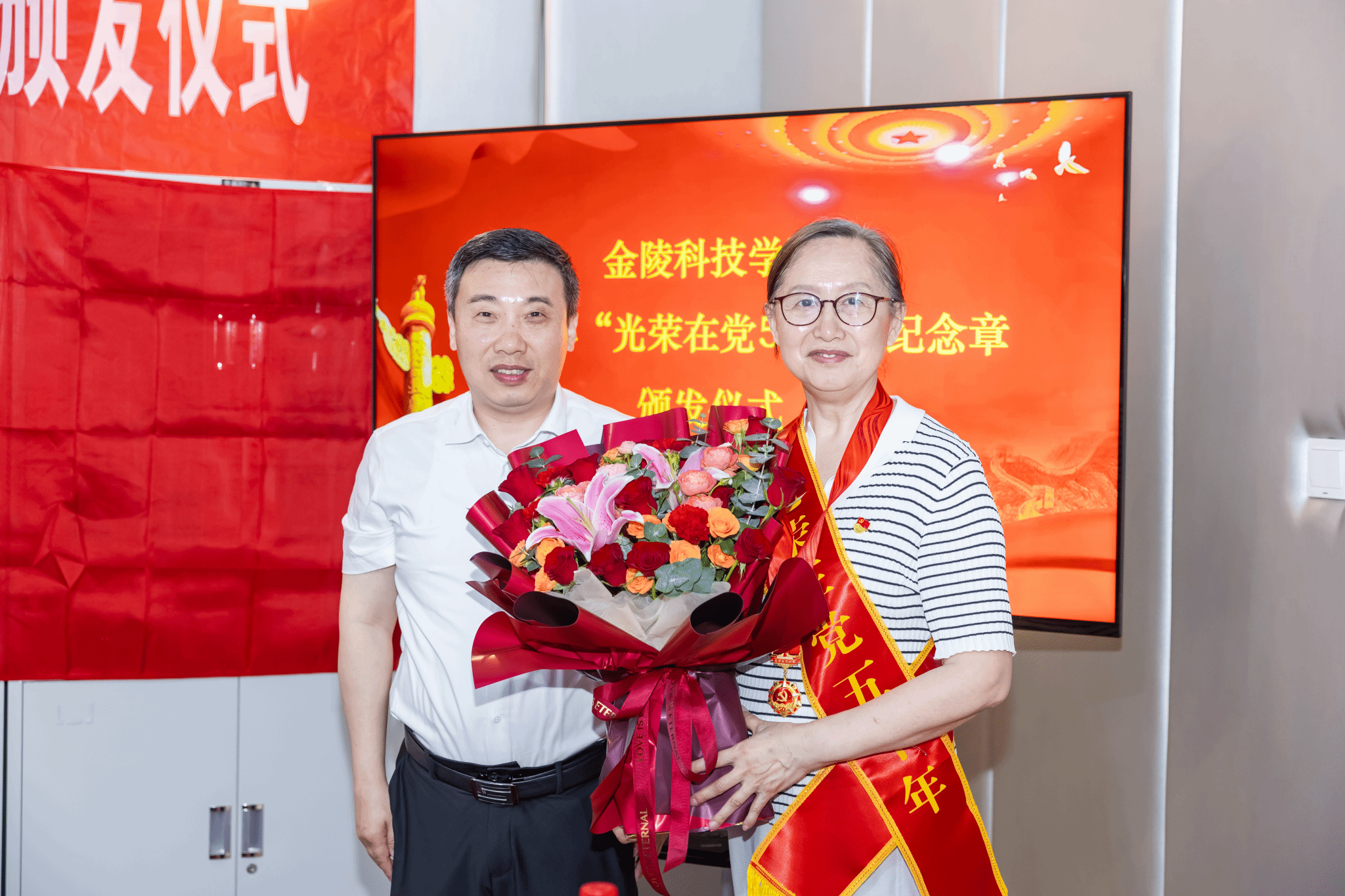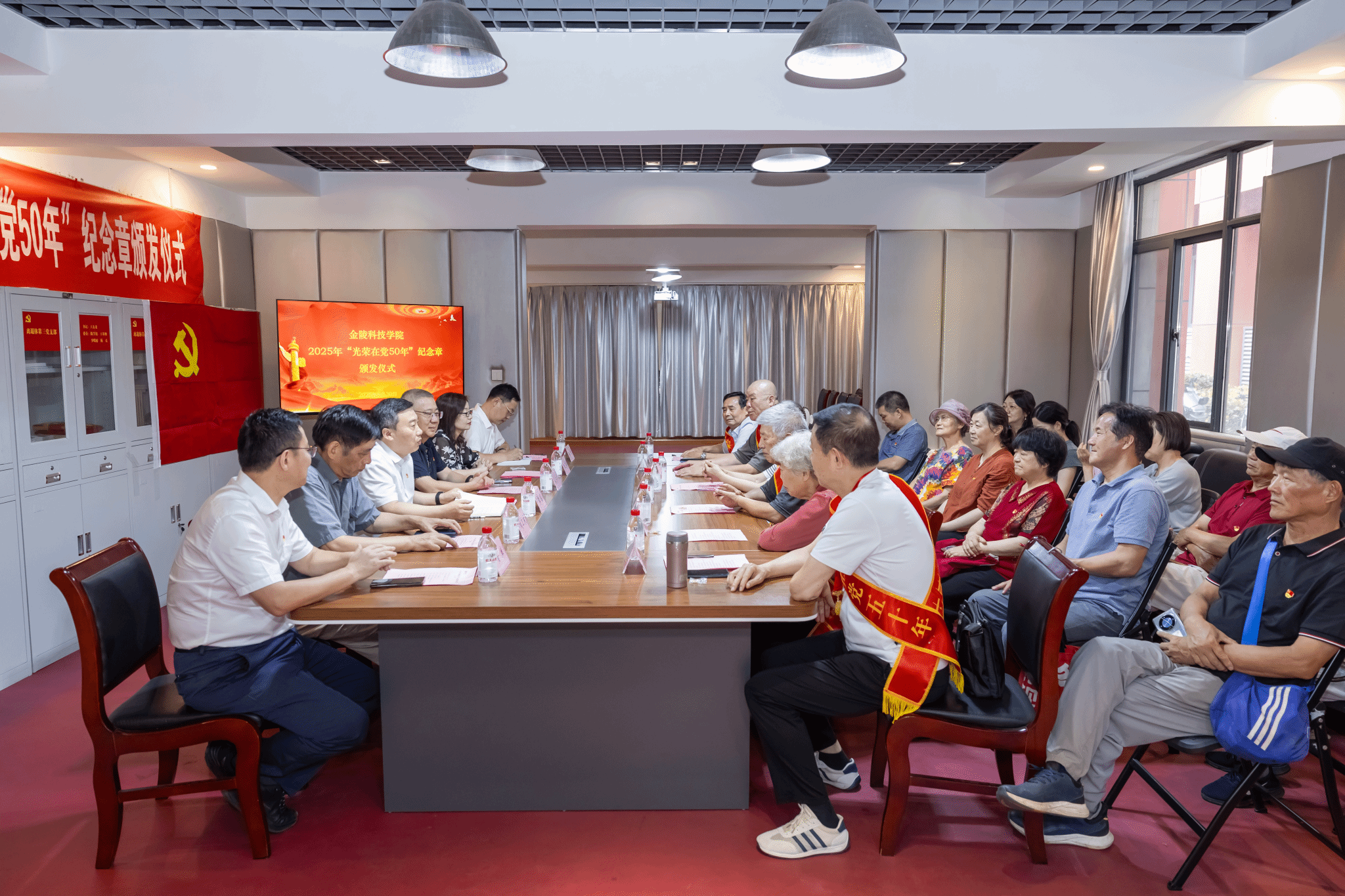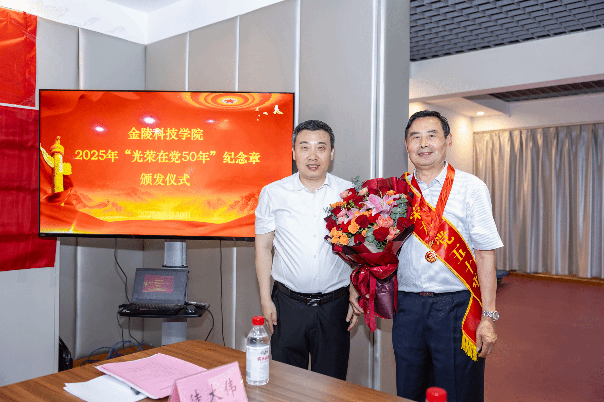 仪式上,季赛带领全体与会党员重温入党誓词。张远凤宣读了获颁纪念章老党员名单,杨志伟、冯世萱、刘大水、王聿林、王永明、沈毅、伍清林等7名老党员获颁2025年“光荣在党50年”纪念章。季赛为与会获颁纪念章老党员颁发、佩戴纪念章。