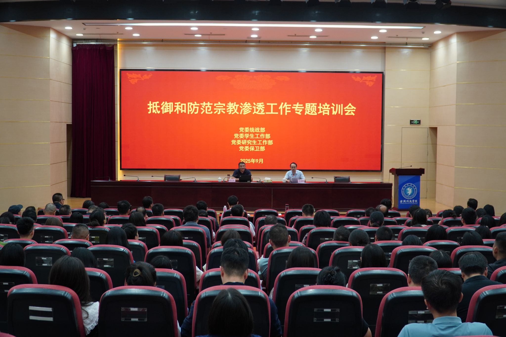 为进一步提高认识,提升工作能力,9月18日,校党委统战部、党委学生工作部、党委研究生工作部和党委保卫部联合在江宁校区科技楼报告厅召开抵御和防范宗教渗透工作专题培训会,邀请专家进行辅导。相关职能部门负责人、二级学院书记、副书记和全体辅导员150余人参加培训。