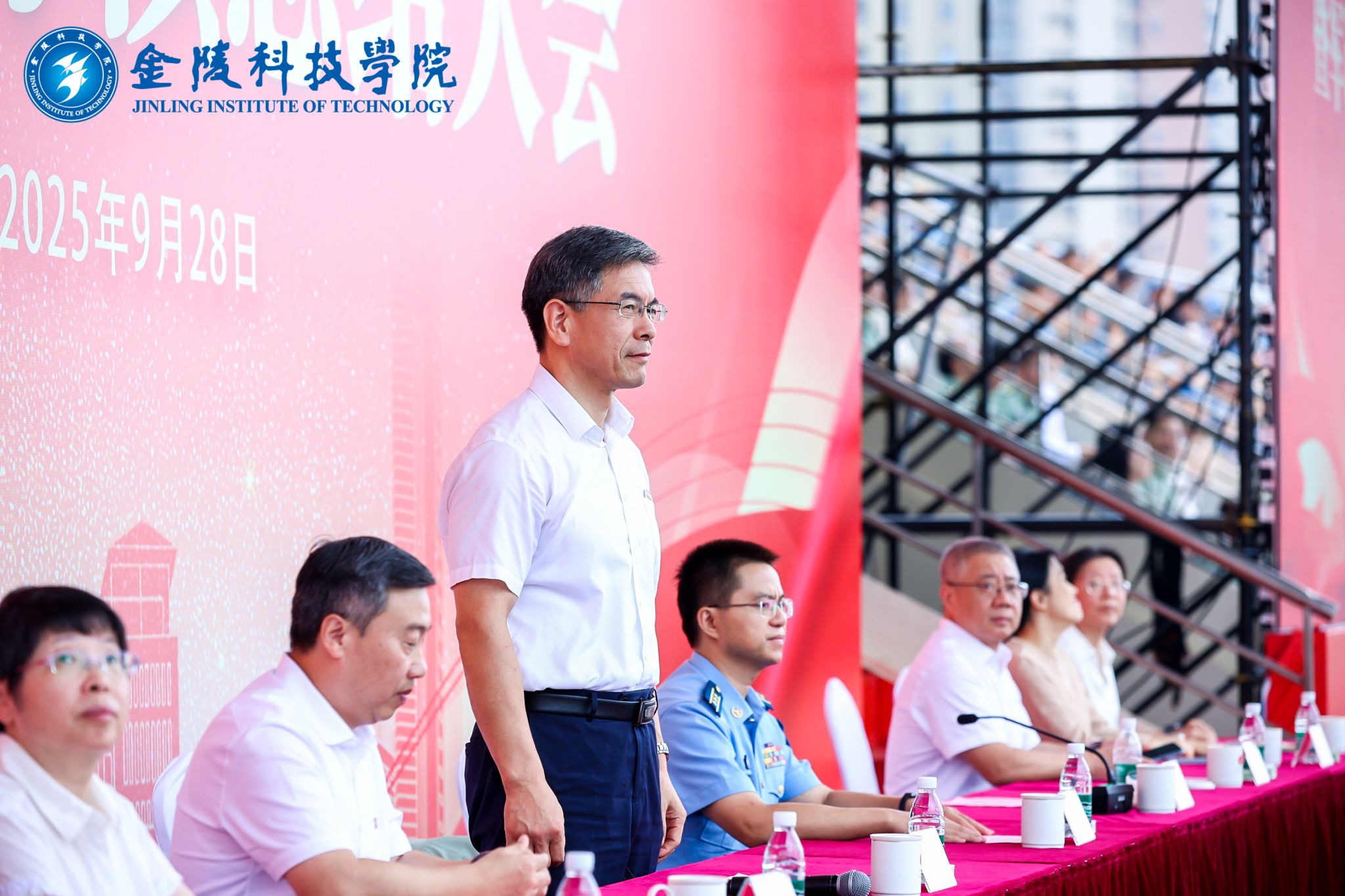 季赛以《每一个梦想都值得全力以赴》为题寄语新生,对同学们在军训中所展现出的优良作风和坚韧不拔的意志,予以高度赞扬和充分肯定,并为新生送上三个“成长锦囊”:一是读懂南京:在城市脉搏中锚定梦想坐标。他以六朝博物馆的励志竹简、明城墙城砖、紫金山实验室芯片等为例,告诉新生南京的 “梦想基因” 贯穿古今,城市就是最好的课堂。他鼓励新生在Citywalk中感悟雨花台的信仰力量、长江大桥的建设记忆,将个人梦想融入城市发展。二是拥抱金科:在大学沃土上解锁梦想赛道。他介绍了学校60余年来以“蓝图变为实景”的行动力,实现了升本、升硕、跻身江苏省一流应用型本科高校建设行列的跨越发展,展现了学校与南京的同频成长。他希望同学们用好学校的“硬核资源”与“暖心buff”,在金科勇敢追梦。三是认识自己:在青春赛道上跑出梦想加速度。他以历届金科学子创新竞赛、就业创业等相关数据、案例,强调“金科学子的可能性没有上限”,鼓励新生在大学生涯中用规划“导航”、靠实践“巡航”、以坚持“续航”,用新时代青年敢闯敢试的精神,将每一次拼搏都变为实现梦想的坚实基石。