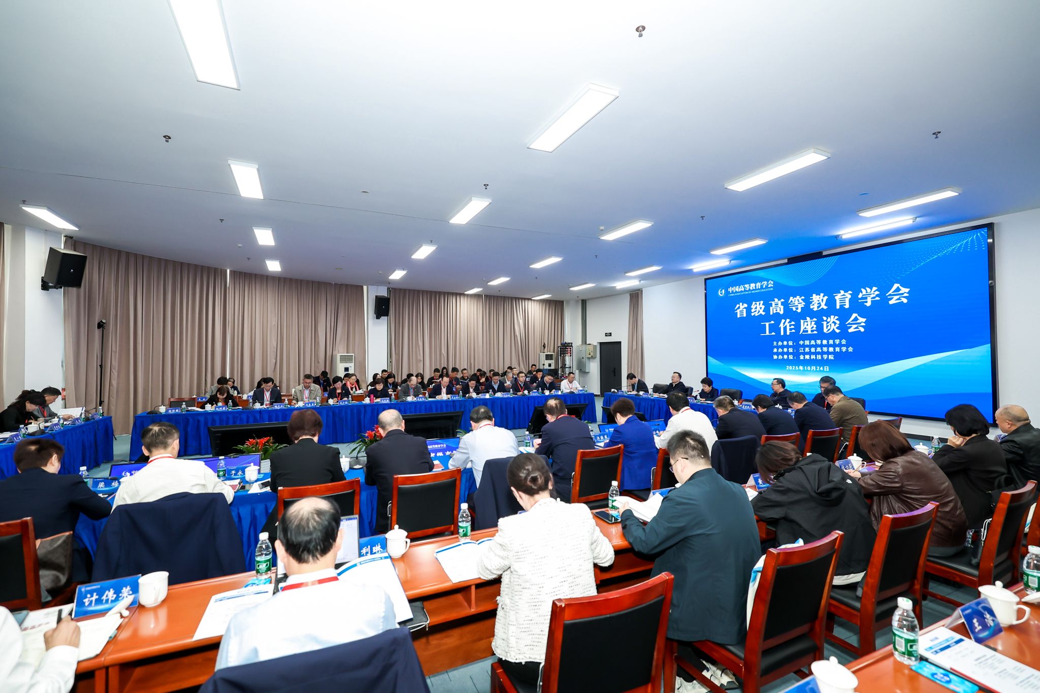 10月24日,在党的二十届四中全会刚刚闭幕之际,中国高等教育学会以“加强联动 深化合作 服务教育强国建设”为主题,在南京召开省级高等教育学会工作座谈会,会议由江苏省高等教育学会承办、beat365协办。江苏省教育厅副厅长杨树兵、beat365党委书记刘志远分别致辞,中国高等教育学会会长林蕙青出席会议并讲话,学会副会长葛道凯作会议总结。28个省学会负责人、教育行政部门有关负责同志、beat365校长季赛参会。会议由学会副秘书长吴英策主持。