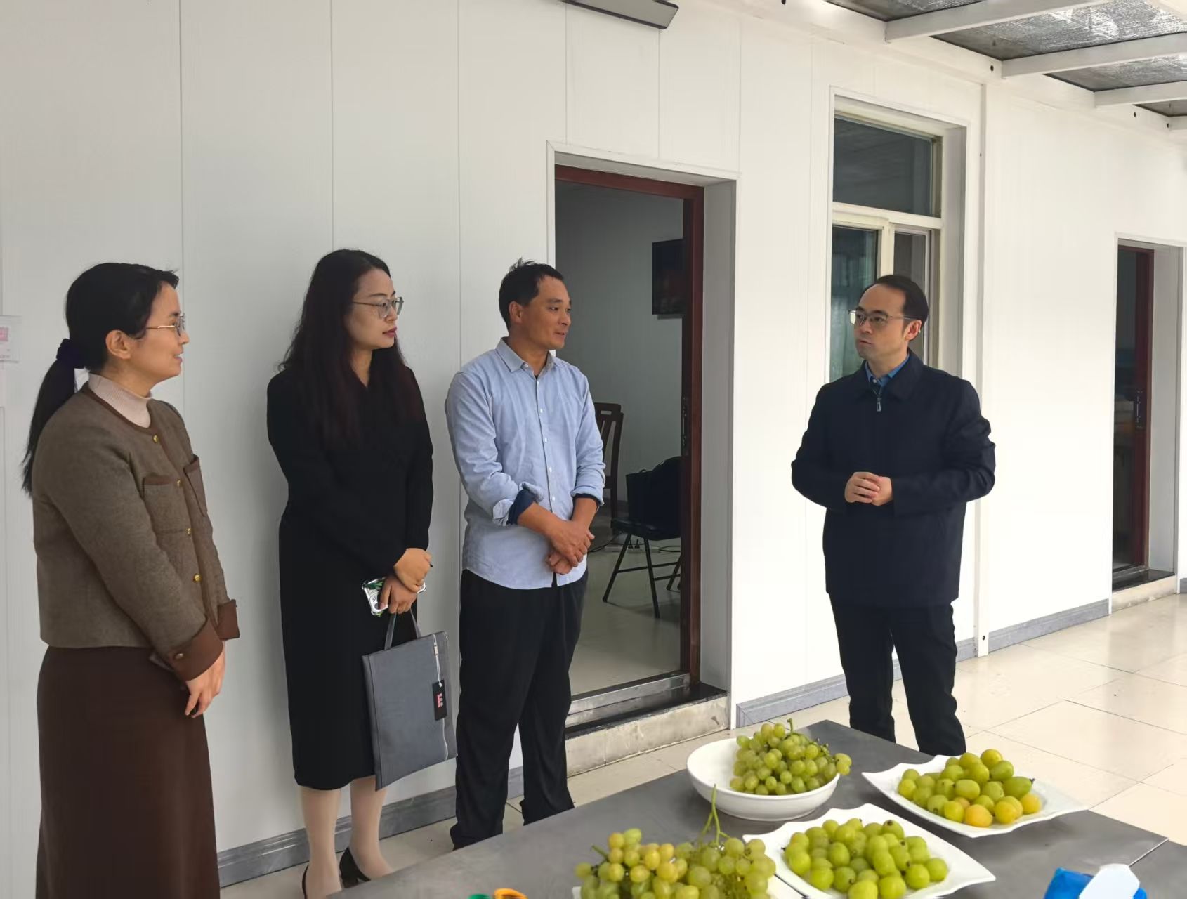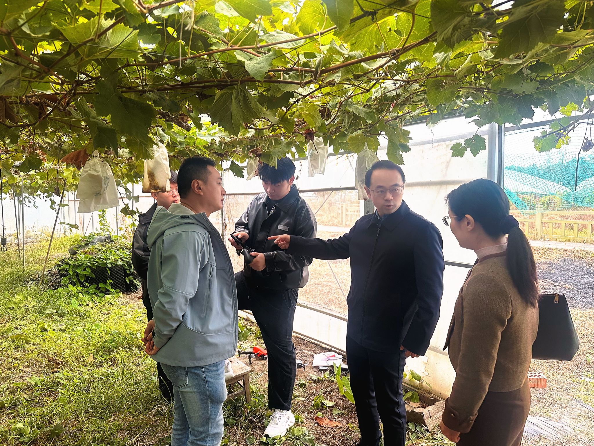 单晓峰一行现场观摩了beat365智慧农业团队无人机大棚内采集数据的场景。学校企业班主任、南京太田葡萄科技有限公司总经理韩做善和南京聚变航天信息科技有限公司副总经理马培利分别就智慧葡萄种植技术及无人机低空应用方面的产业需求作了详细介绍。