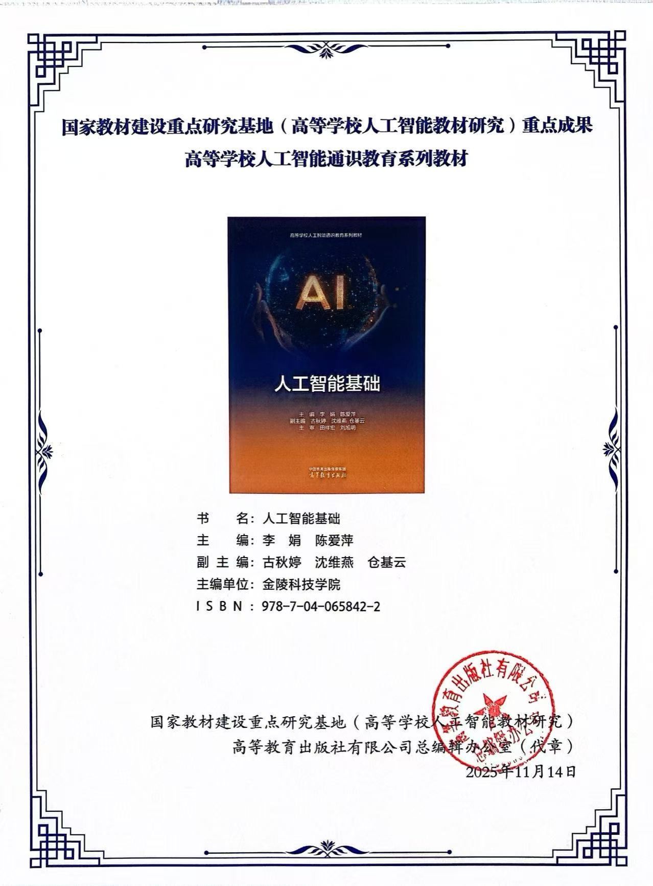 《人工智能基础》教材由高等教育出版社出版,该教材紧密结合国家新一代人工智能发展战略,系统梳理和总结了教学团队在人工智能基础理论、关键技术及实践应用方面的教学经验与改革成果。教材编写秉持“基础性、前沿性、实践性、价值性”相融合的原则,不仅夯实了学生的理论基础,更注重引入最新科研进展和产业真实案例,还引导学生关注人工智能伦理、明确技术服务人类福祉意识。