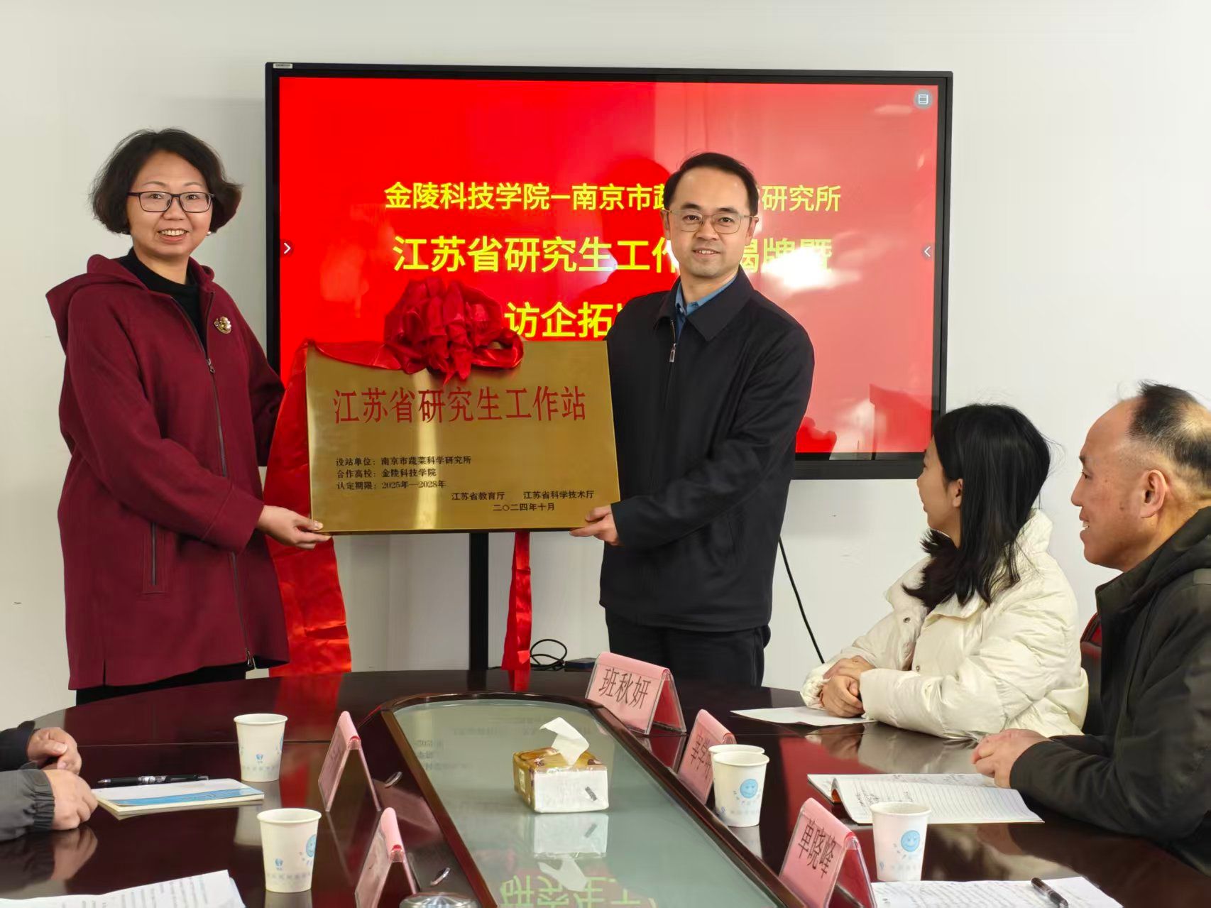 11月28日,beat365与南京市蔬菜科学研究所共建的江苏省研究生工作站揭牌仪式在南京市蔬菜科学研究所横溪园区举行。校党委副书记单晓峰及研究生处、园艺园林学院相关负责人、骨干教师;南京市蔬菜科学研究所党总支书记吴洋,副所长黄少华、马琳娜及相关科室人员参加揭牌仪式。