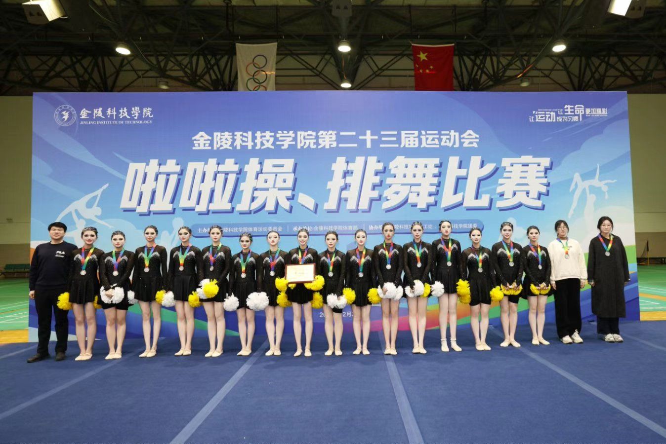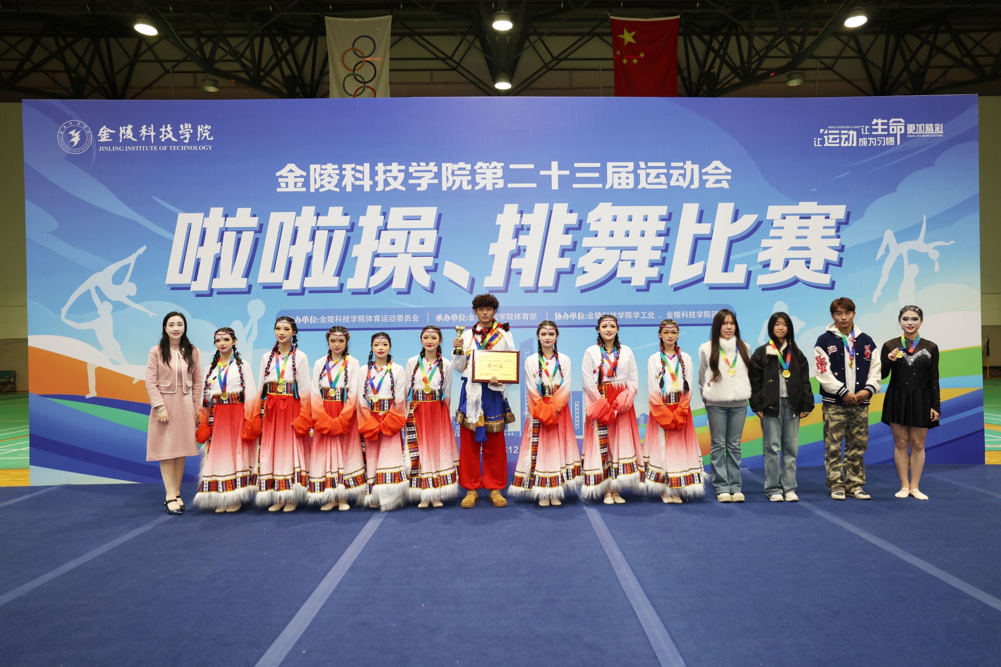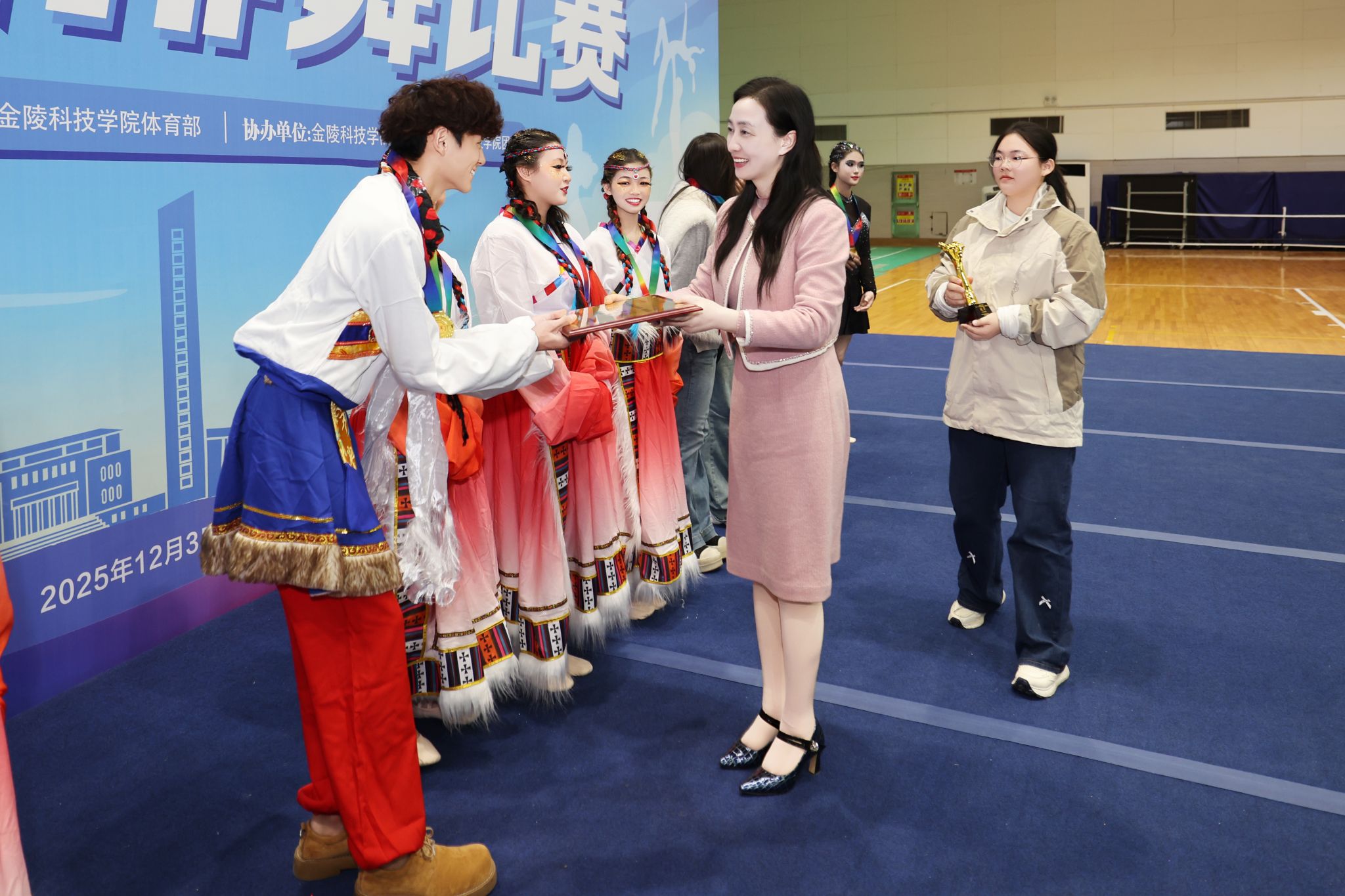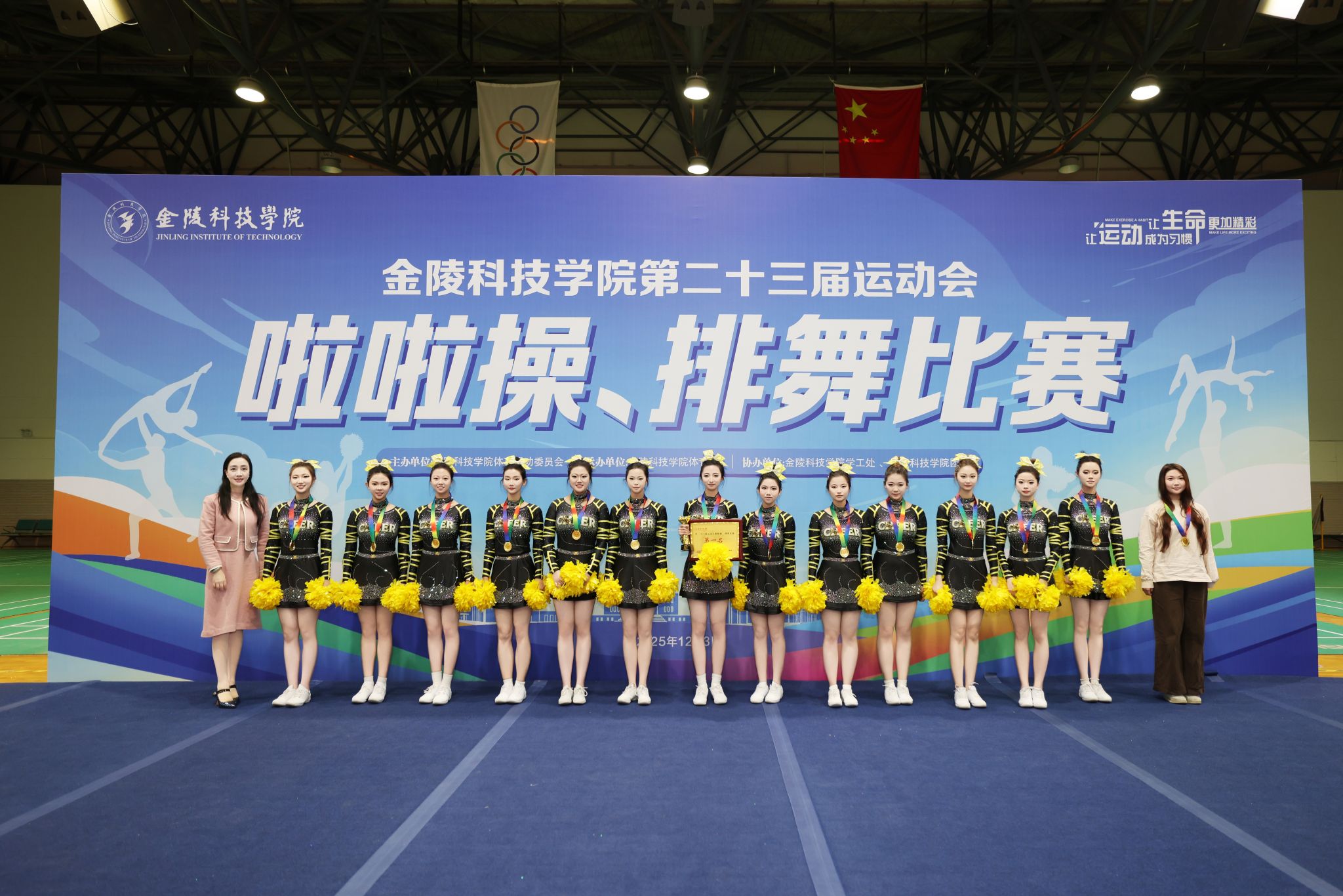闭幕式上,副校长顾晓燕、教务处处长田祥宏、学生工作处处长汪如春分别为获奖代表队颁奖。跃动青春,活力金科,在全面建设特色鲜明的高水平应用型大学新征程上,金科学子将继续以舞步为桨、以花球作帆,在体育强国建设的时代浪潮中奋楫争先、逐梦远航。