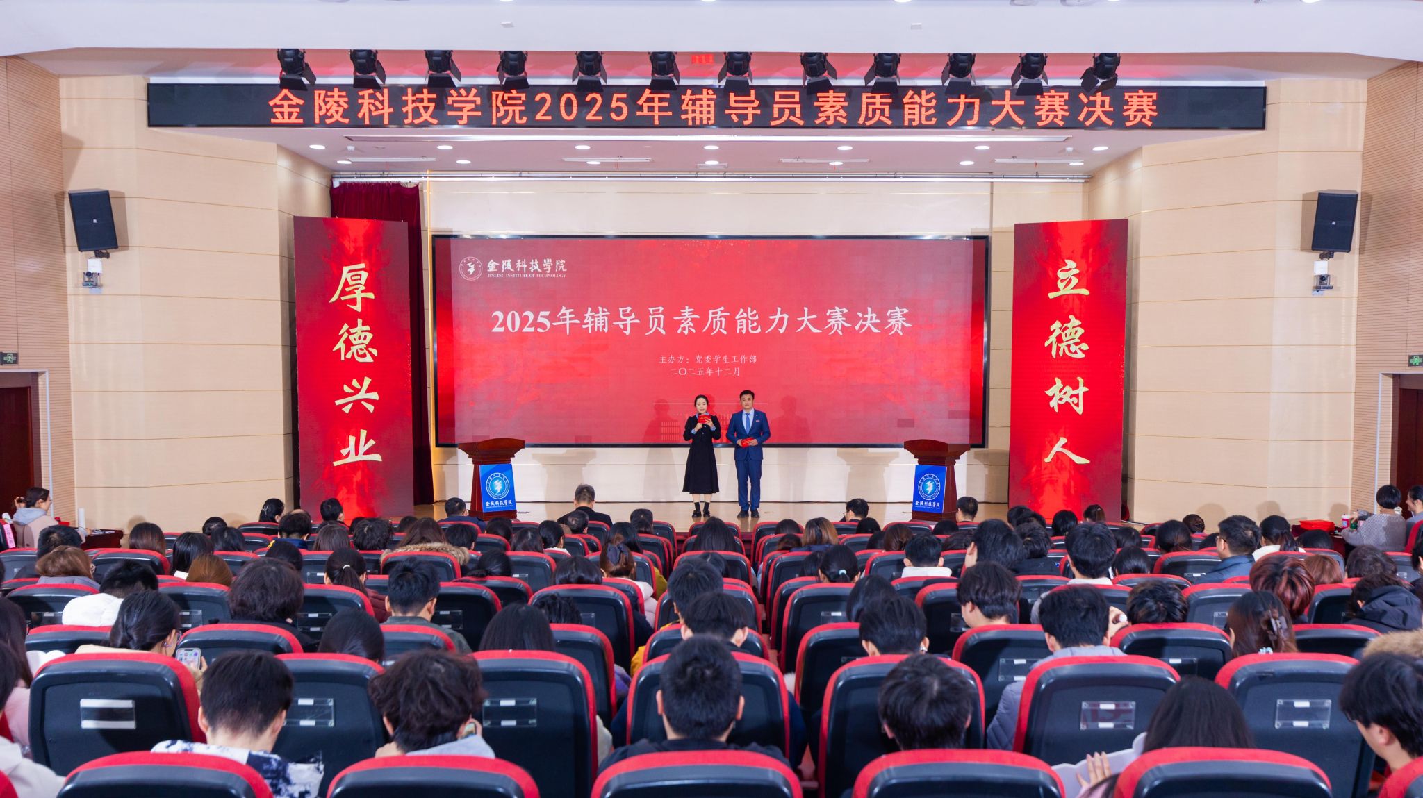 12月17日下午,beat3652025年辅导员素质能力大赛决赛在江宁校区科技楼报告厅举行。校党委副书记单晓峰出席活动,南京晓庄学院党委学生工作部部长吴鑫、三江学院党委学生工作部部长周学军、南京师范大学党委学生工作部副部长汪育文应邀担任大赛评委。学校相关职能部门负责人,各二级学院学生工作书记、副书记,辅导员及学生亲友团到场观摩比赛。