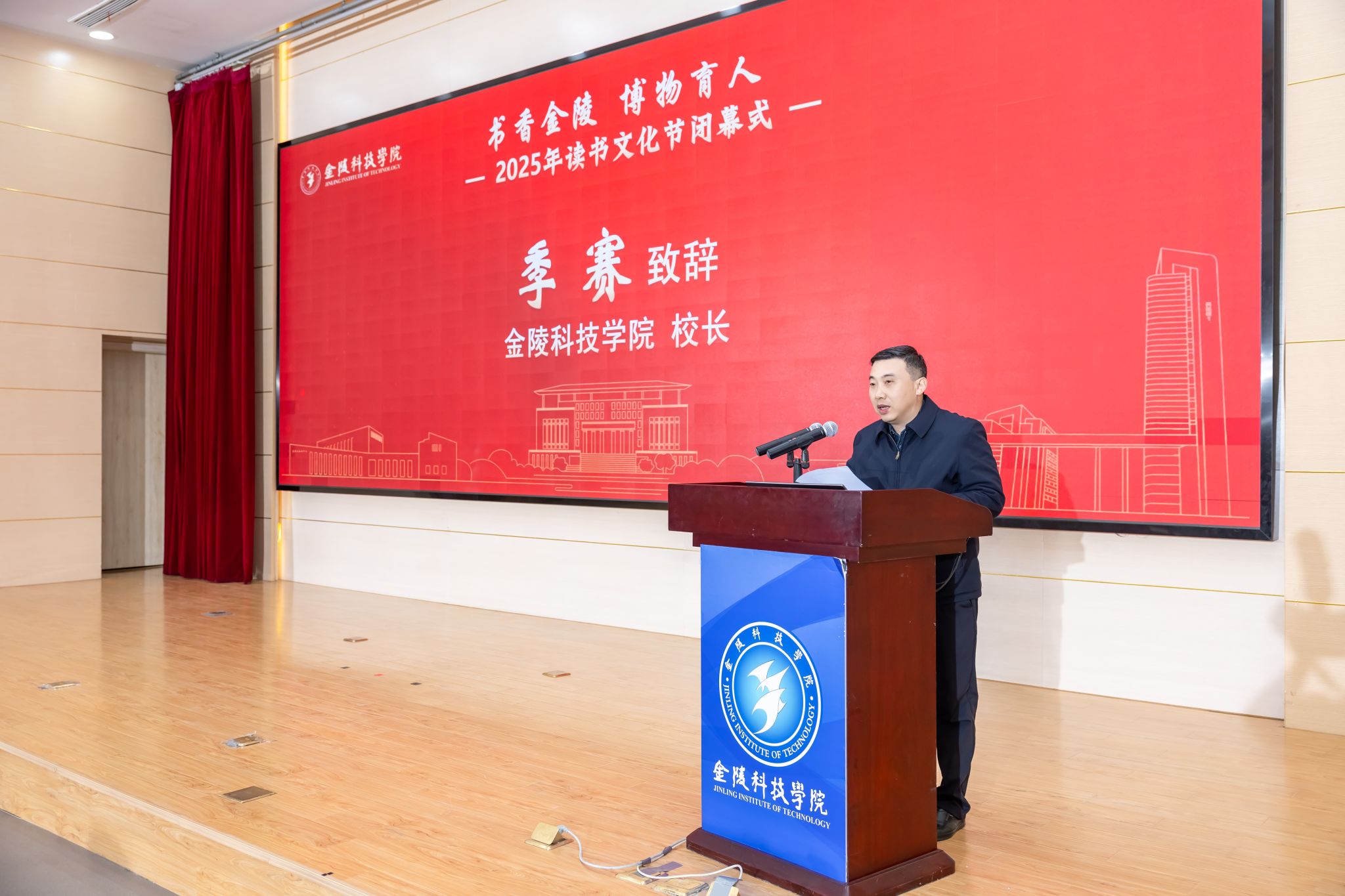季赛在致辞中对读书文化节的圆满举办给予高度评价。他指出,本次读书文化节是学校“南京化体系战略”在书香校园建设中的一个生动实践。老师和同学们坚持“读万卷书”与“行万里路”相贯通,在“典籍里的南京”和“博物馆里的南京”交相辉映中读懂了城市文脉、汲取了文化力量。同时,他向全体师生提出希望:一是以书为友、让阅读成为习惯,要将“案头读书”与“实地读城”紧密结合,凝聚起担当时代大任的青春力量;二是以用为要,让成长绽放光芒,要把阅读收获转化为成长动能,将金陵文脉的滋养、专业知识的启迪融入学习实践,在创新发展的浪潮中奋勇争先;三是以合为贵,让育人协同并进,要深化“博物育人”理念,推动校园文化与城市文化深度融合,打造更多特色阅读品牌活动,为学子成长持续赋能。