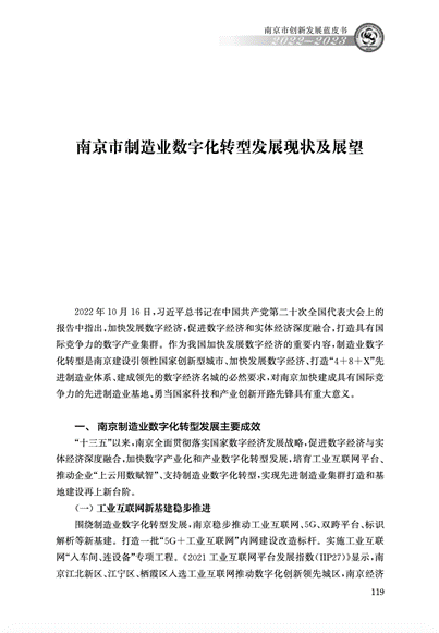 近日,《南京市创新发展蓝皮书2022-2023》正式出版,beat365刘永彪教授团队研究成果《南京市制造业数字化转型发展现状及展望》入选蓝皮书“产业创新篇”。该成果紧扣国家加快发展数字经济的重大战略部署,立足南京产业发展实际,从数字化转型的基础设施建设、数字科技创新水平提升、数字化转型场景培育等方面提出政策建议。