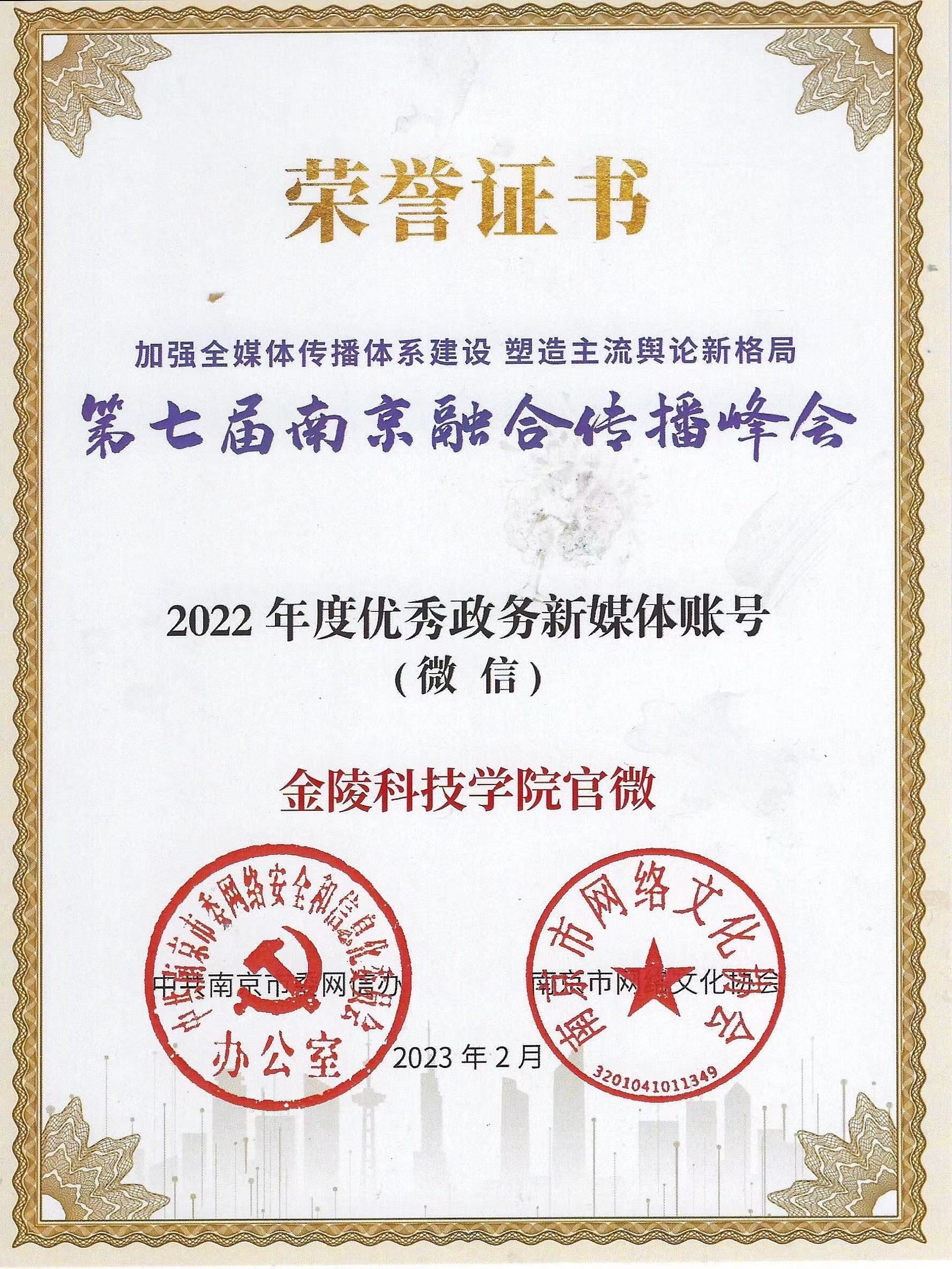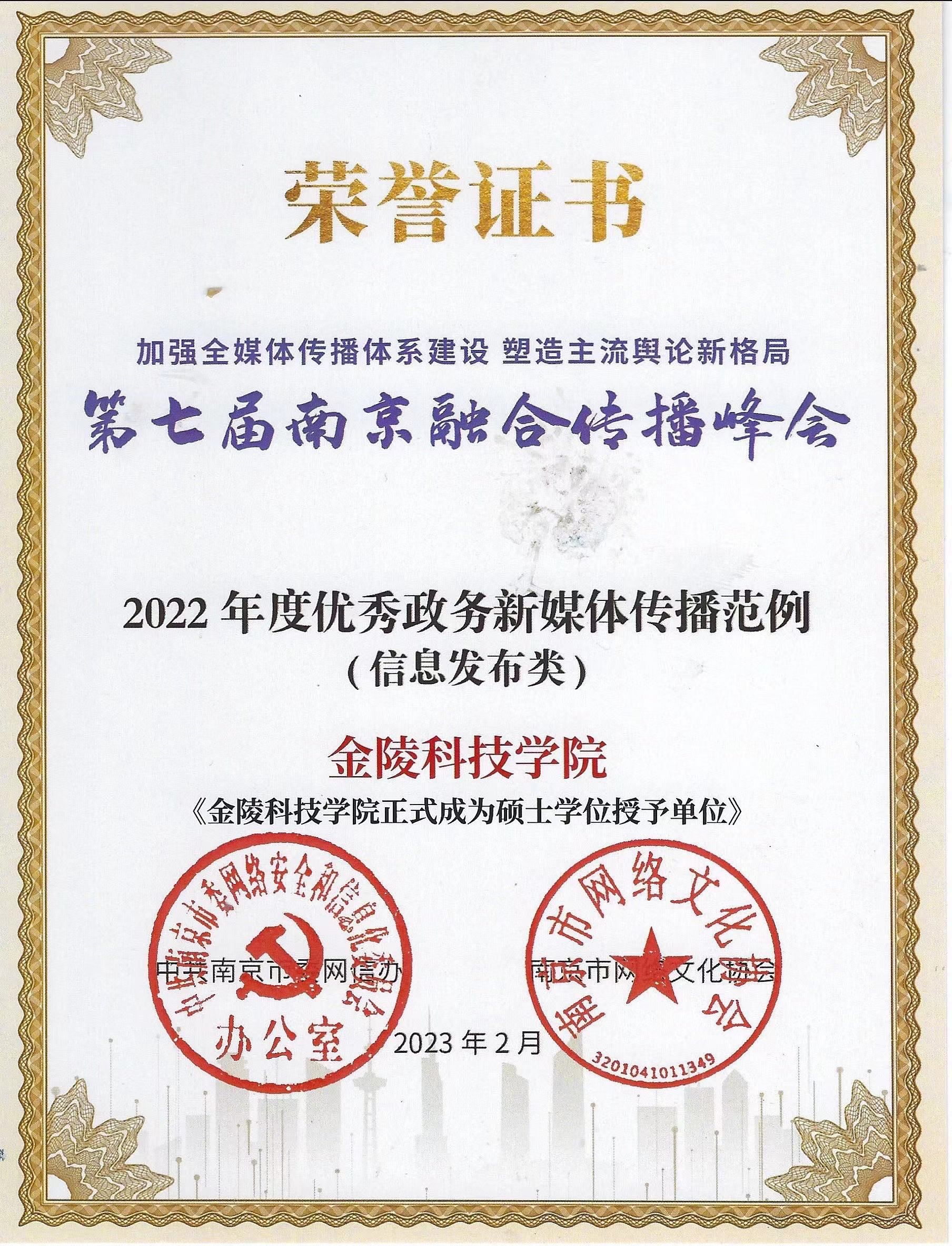 2月22日下午,在由中共南京市委宣传部等单位主办、南京政务舆情研究院等单位承办的2022南京融合传播峰会上,beat365beat365正版唯一官网必一官微获2022年度优秀政务新媒体账号;《beat365正版唯一官网必一正式成为硕士学位授予单位》获2022年度优秀政务新媒体传播范例(信息发布类)。这是beat365连续第3年在该会中获奖。