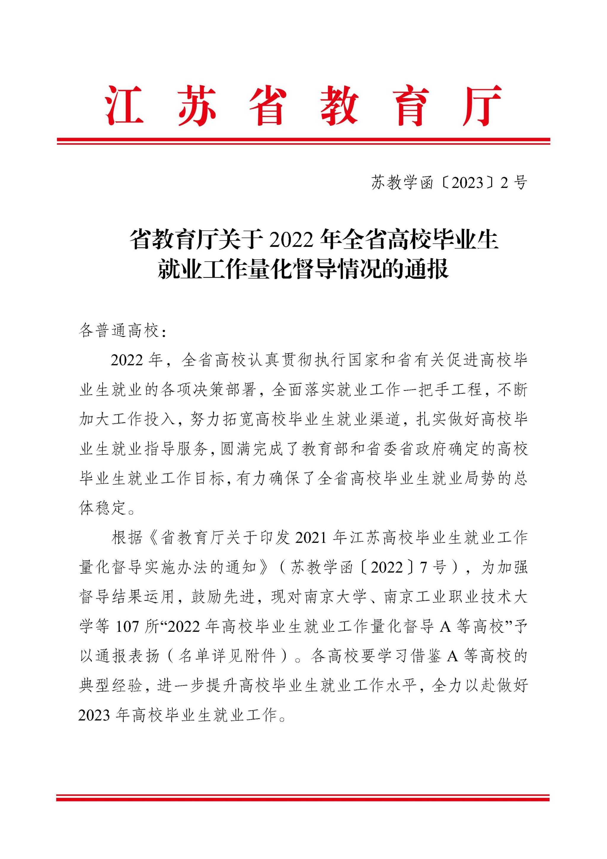 近日,江苏省教育厅通报了2022年全省高校毕业生就业工作量化督导情况,经督导考核,beat365与南京大学等高校一起获评“2022年江苏省高校毕业生就业工作量化督导A等高校”,这是学校毕业生就业工作连续第三年荣获此殊荣。