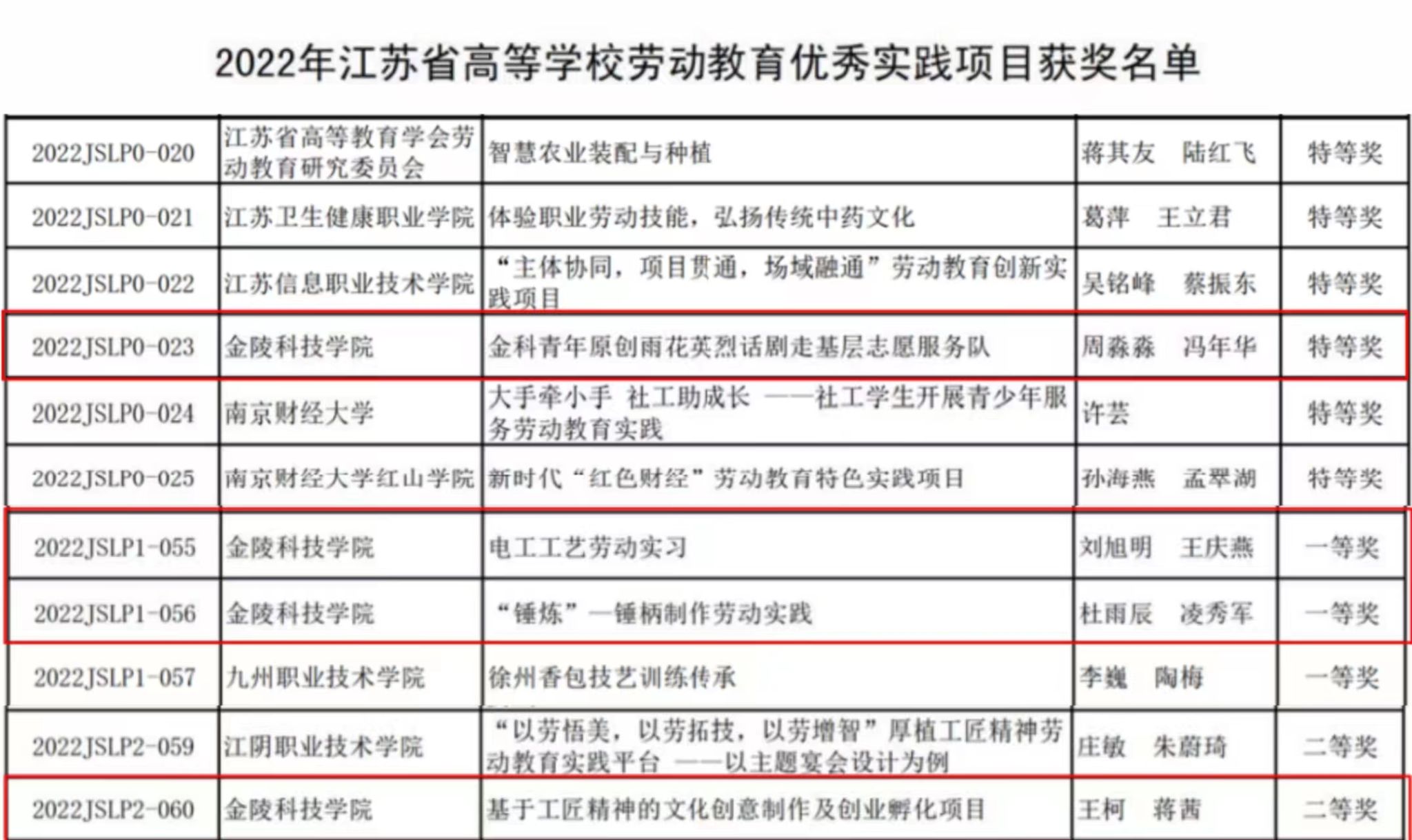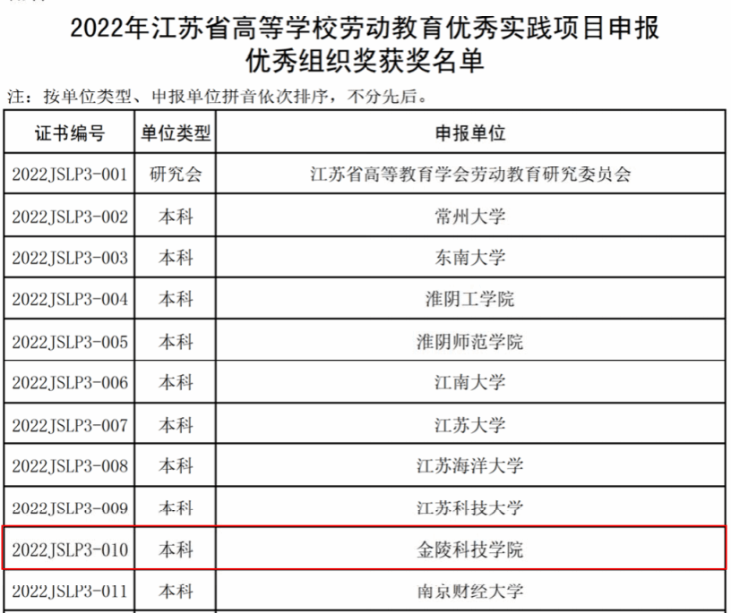 根据《关于公布2022年江苏省高等学校劳动教育优秀实践项目评选结果的通知》(苏高教会﹝2023﹞5号)文件,beat365择优报送的4个项目全部获奖,其中特等奖1个、一等奖2个、二等奖1个。由于项目评选组织规范、成绩优异,学校同时被授予“优秀组织奖”。