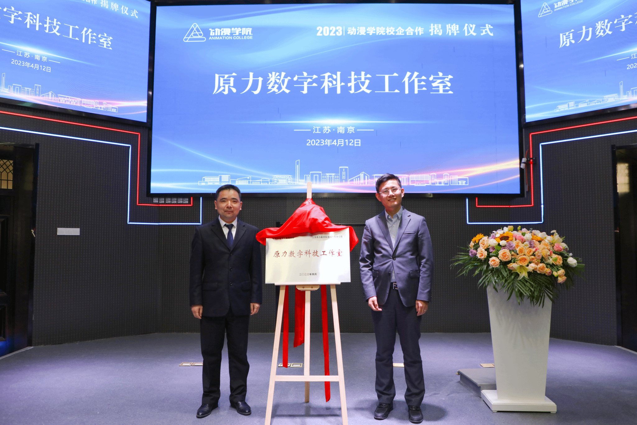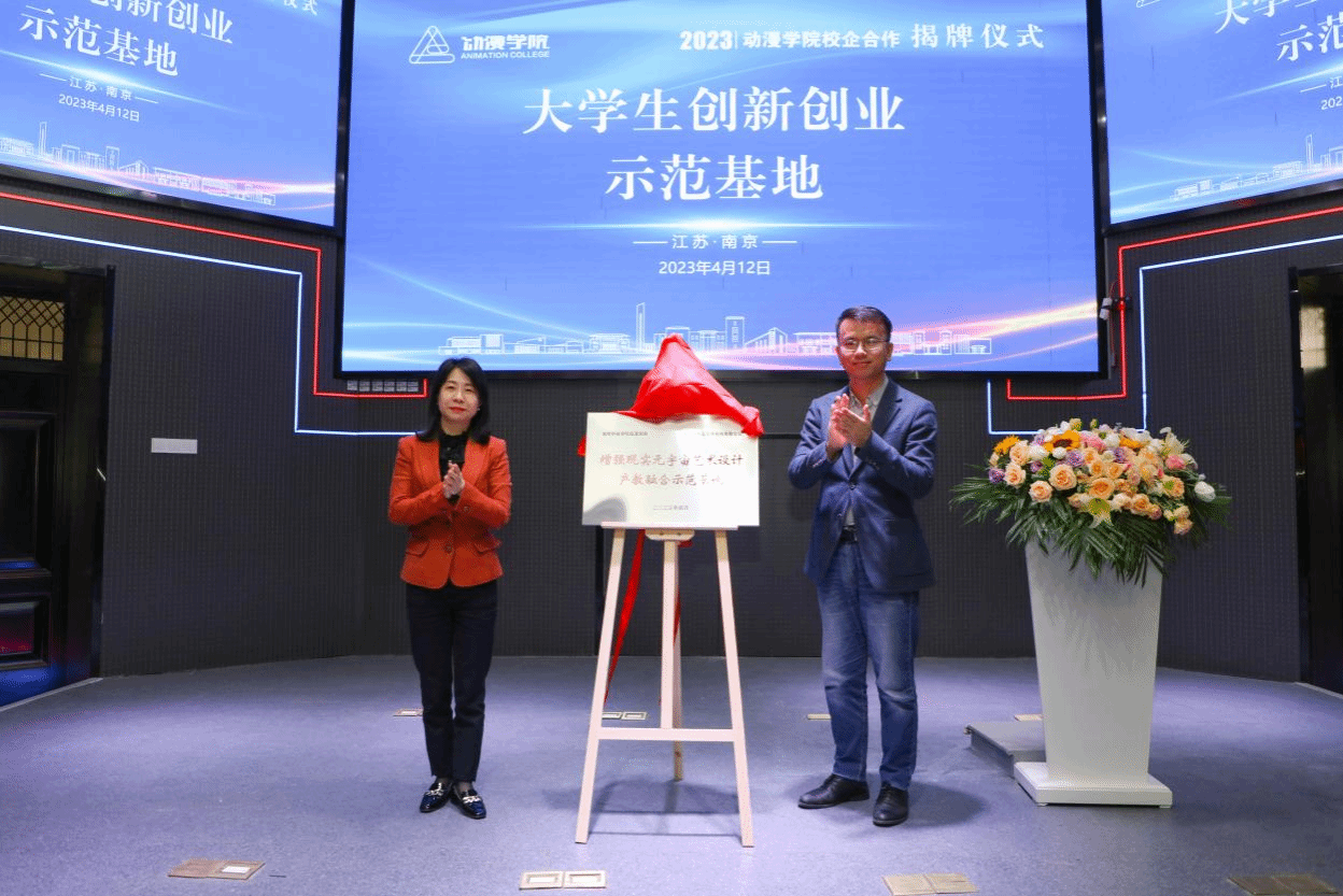 活动现场,动漫学院与南京报业集团云客网络科技有限公司签订融媒体数字创意产教融合示范基地合作协议,与南京视网么信息科技有限公司签订增强现实元宇宙产教融合示范基地协议。张燕、陈朝晖为融媒体数字创意产教融合示范基地揭牌,王贤波、董自亭为原力数字科技工作室揭牌,动漫学院副院长匡才远和南京视网么信息科技有限公司副总经理蒋苏为AR创新设计与应用实验室揭牌。