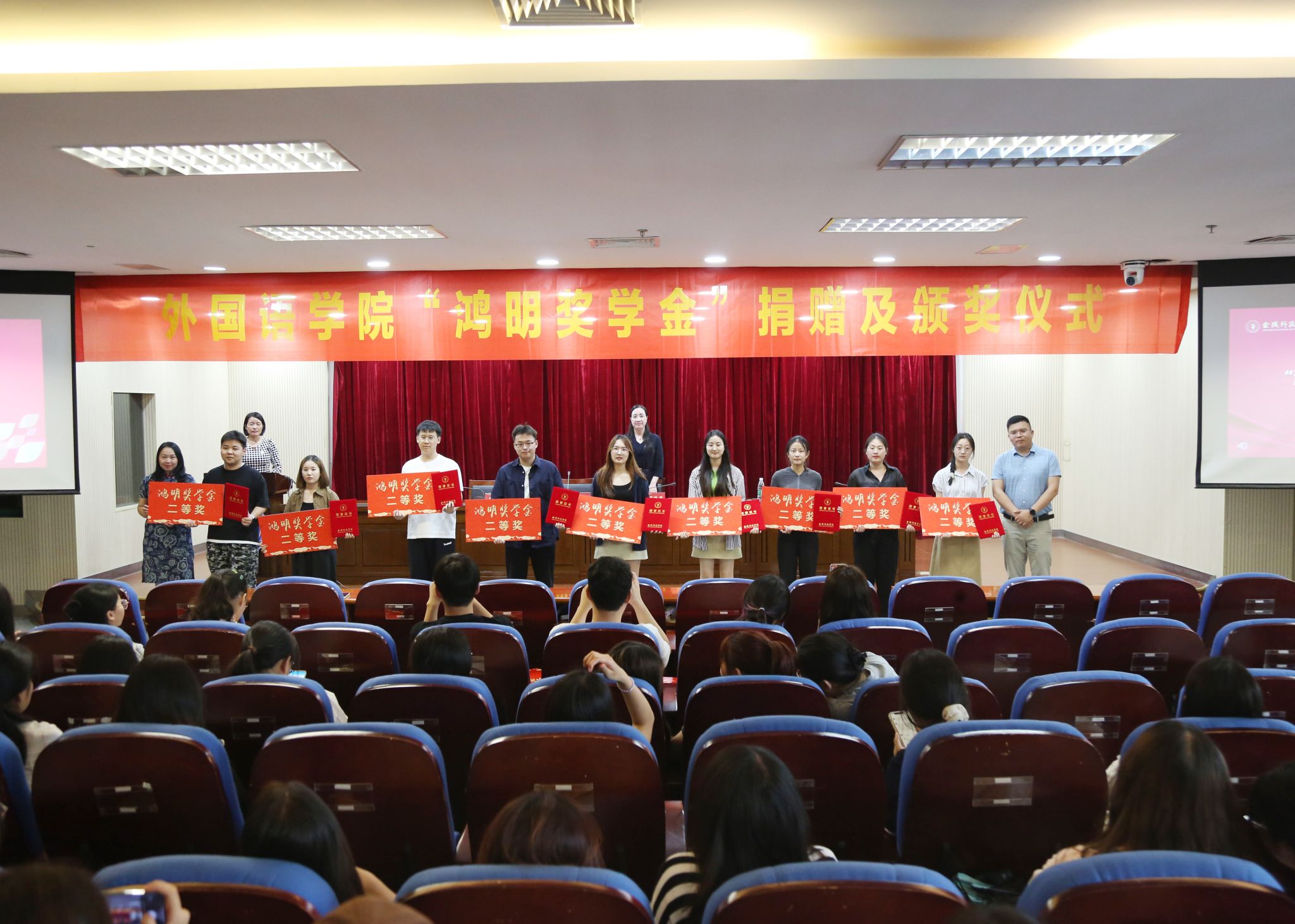 6月16日下午,外国语学院在图书馆第二报告厅举办“鸿明奖学金”捐赠及颁奖仪式,副校长顾晓燕出席活动并讲话,外国语学院领导班子和学生代表参加活动。