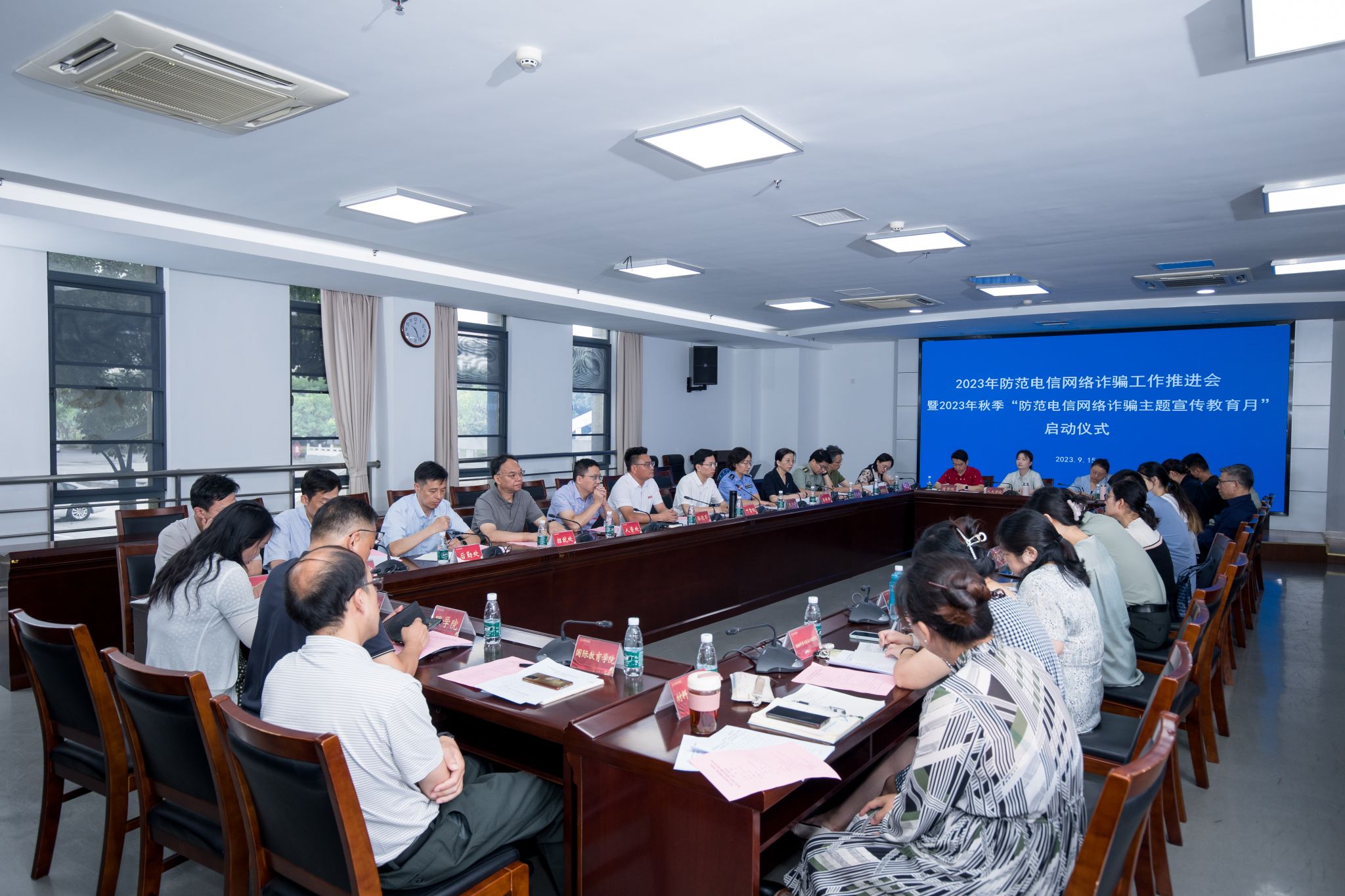 为深入贯彻落实习近平总书记关于打击治理电信网络诈骗犯罪工作的重要指示精神,落实省、市工作要求,进一步推进校园防范电信网络诈骗工作,有效保护师生员工生命财产安全,9月15日上午,beat365在江宁校区图书馆第一报告厅召开2023年防范电信网络诈骗工作推进会暨2023年秋季“防范电信网络诈骗主题宣传教育月”启动仪式。副校长叶智锐出席会议并讲话,市公安局内保支队四级高级警长陈川宁应邀参会。保卫处处长骆德军主持会议。