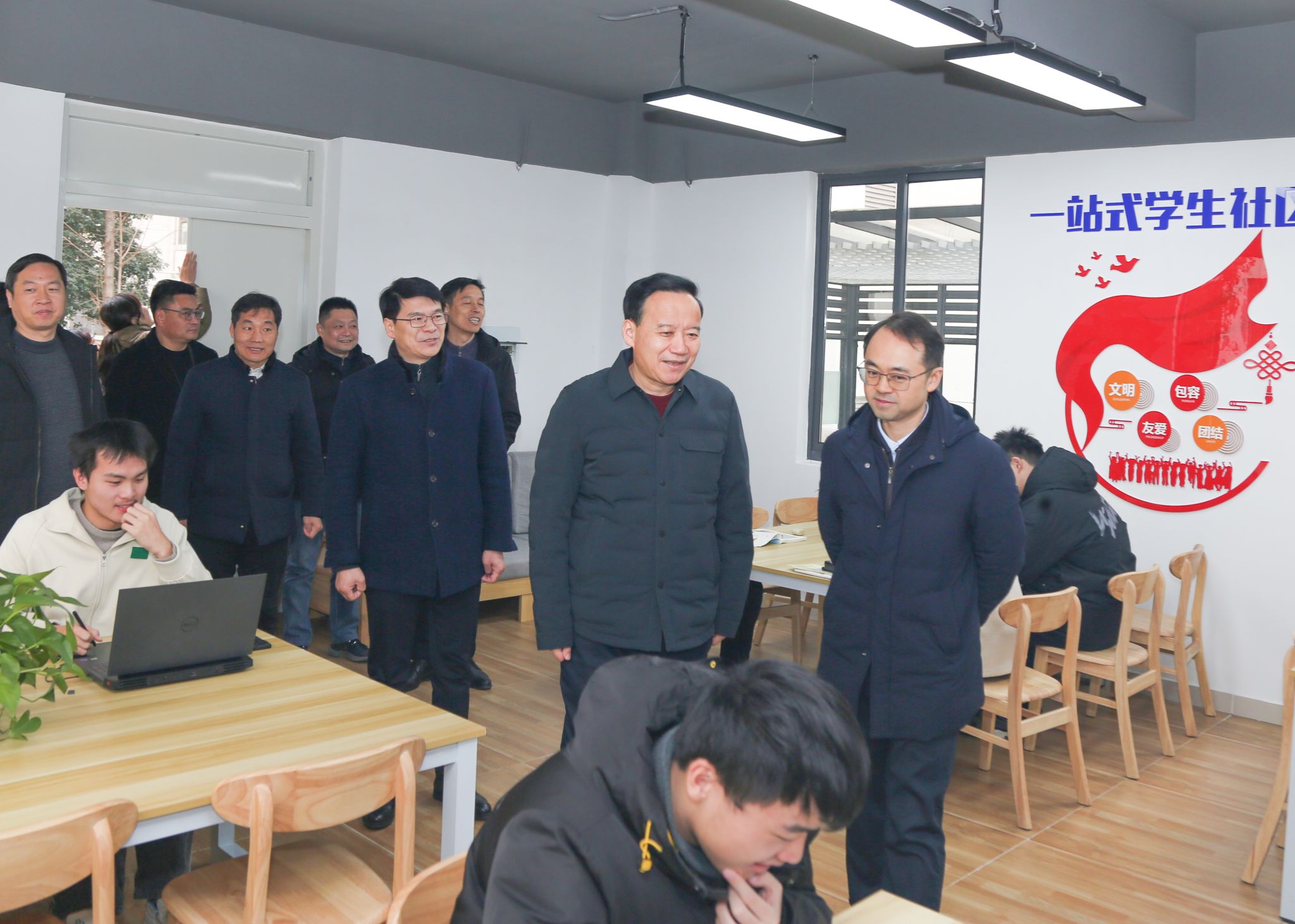 12月26日上午,校长刘永彪调研beat365“一站式”学生社区,实地走访了“一站式”学生社区学生心理健康辅导室、退役大学生事务工作站、金科青年之家、辅导员谈心谈话室、学生综合活动室等场所,看望了各社区点学生并与他们亲切交流。校党委副书记单晓峰,校长办公室、学生工作处、研究生处、招生与就业指导处、保卫处、后勤管理处等相关部门负责人参加此次调研活动。