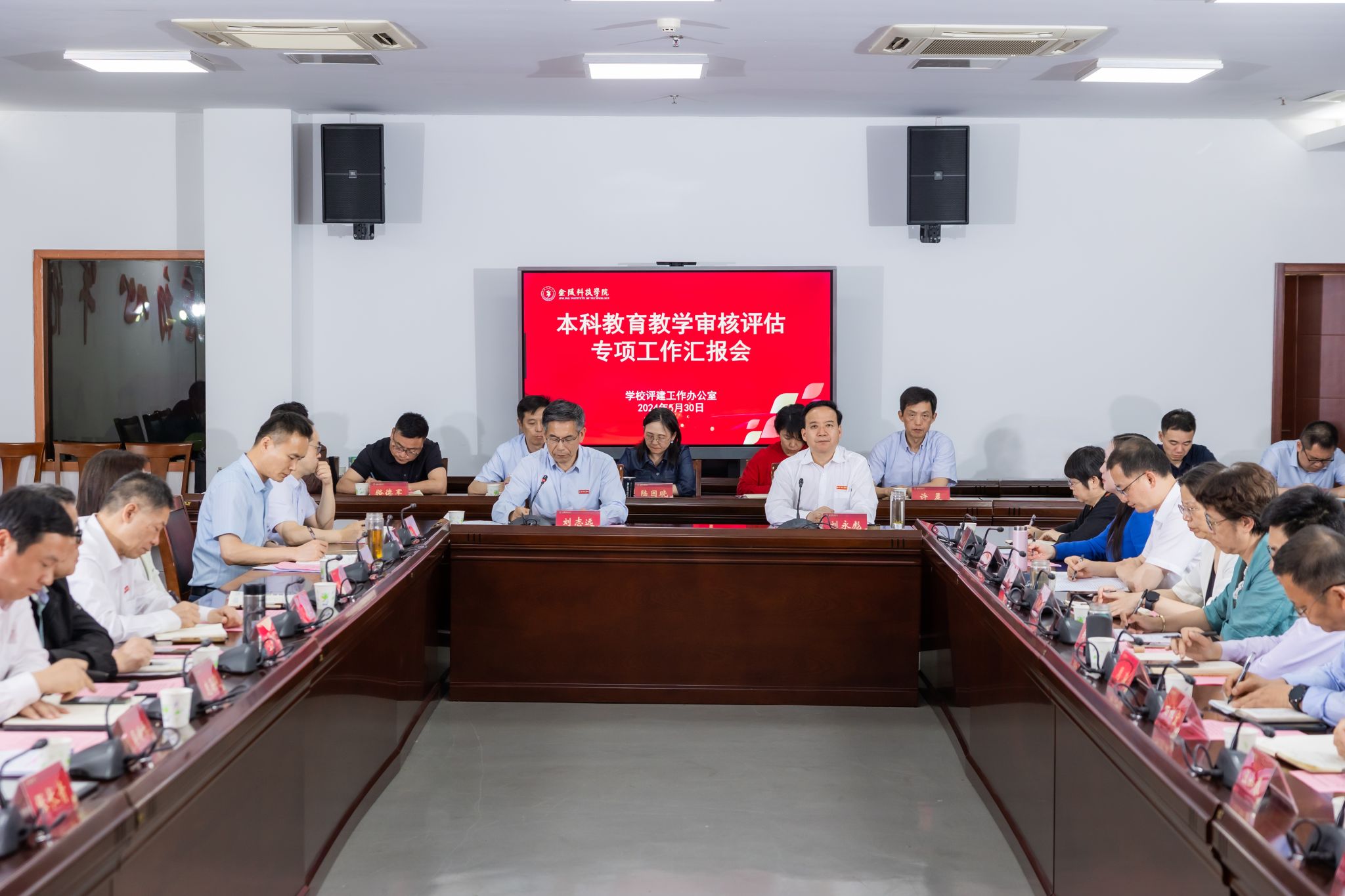 5月30日,学校在图书馆第一报告厅召开本科教育教学审核评估专项工作汇报会。在校的校领导出席会议,校党委书记刘志远作讲话,校长刘永彪主持会议。审核评估8个专项工作组、专项督查组成员单位主要负责人和20个二级学院(部)行政主要负责人参加会议。