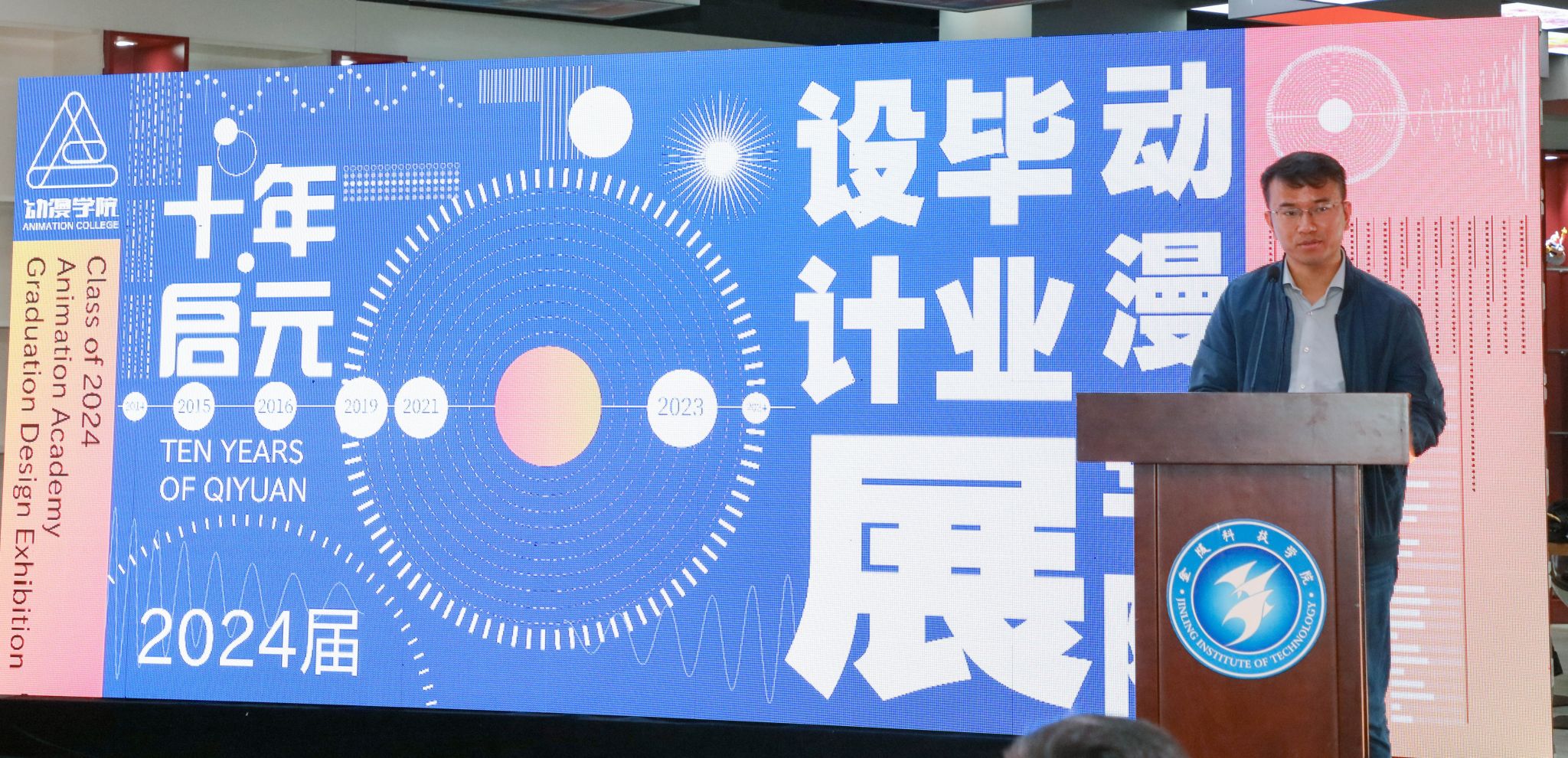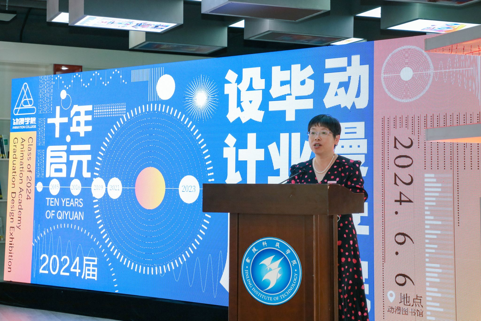 刘志远、刘永彪、张燕、顾晓燕共同启动动漫学院2024届毕业设计展开幕大屏。