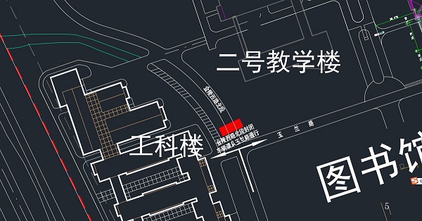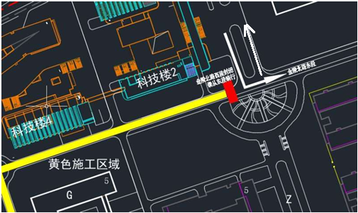 注意:北门进出车辆请从金陵北路东段通行(图一白色箭头进出方向);由金陵西路(工科楼东侧路段)前往科技楼车辆,请从玉兰路绕行(图二白色箭头为绕行方向);所有进入科技楼的机动车请从科技楼北侧路口进入(图三白色箭头为进入方向)。
