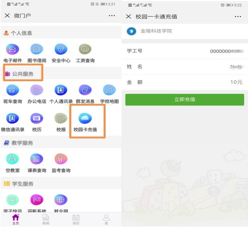 校园卡可以在金科院微门户直接进行充值,操作简单、方便快捷,具体操作步骤如下: