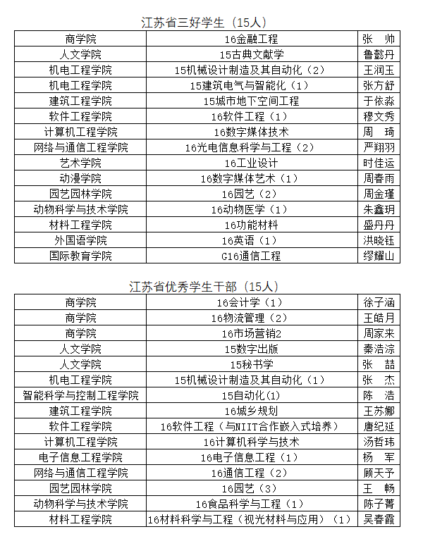 根据《省教育厅团省委关于评选2019年度江苏省普通高校省级三好学生、优秀学生干部和先进班集体的通知》(苏教学函﹝2019﹞3号)文件的要求,经各学院推荐,学生工作委员会评选,拟决定推荐16金融学(3)等11个班级为省级先进班集体,张帅等30名学生为省三好学生和优秀学生干部,现将名单公示如下。