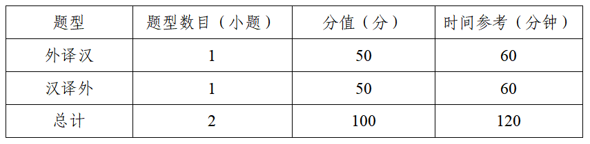 笔译试卷满分为100分,时间为120分钟,共2种题型2道题,全部为主观题;选手可使用中译外、外译中字典各1本。