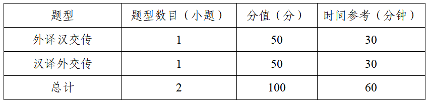 口译试卷满分为100分,时间为60分钟,共2种题型2道题,全部为主观题。