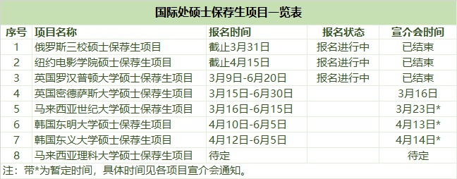 为拓宽学生国际视野,为学生创造海外学习交流机会,国际合作与交流处开发了10所国外大学硕士保荐生项目,现将有关信息通知如下: