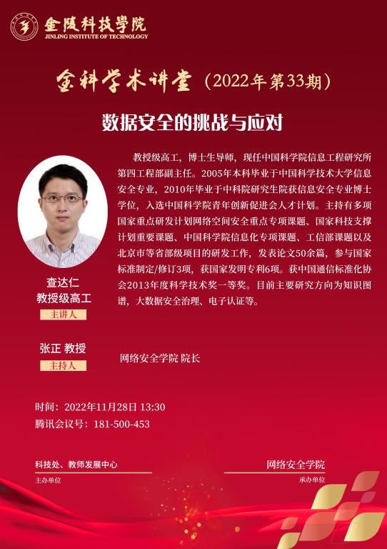 关于举办线上“金科学术讲堂——数据安全的挑战与应对”学术报告的通知