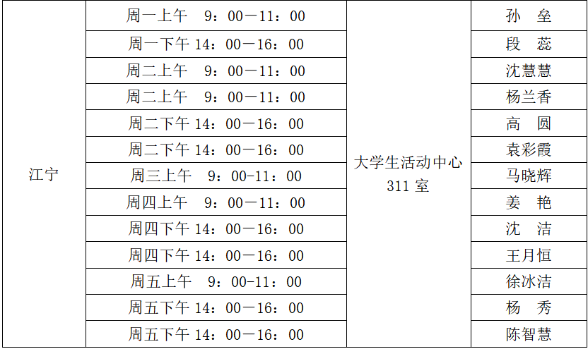 备注:大学生心理健康教育中心专职教师,周一至周五工作时间均可预约咨询。