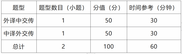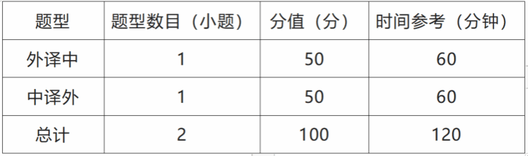 满分为100分,时间为120分钟,共2种题型2道题,全部为主观题;参赛选手可使用中译外、外译中纸质版词典各1本。