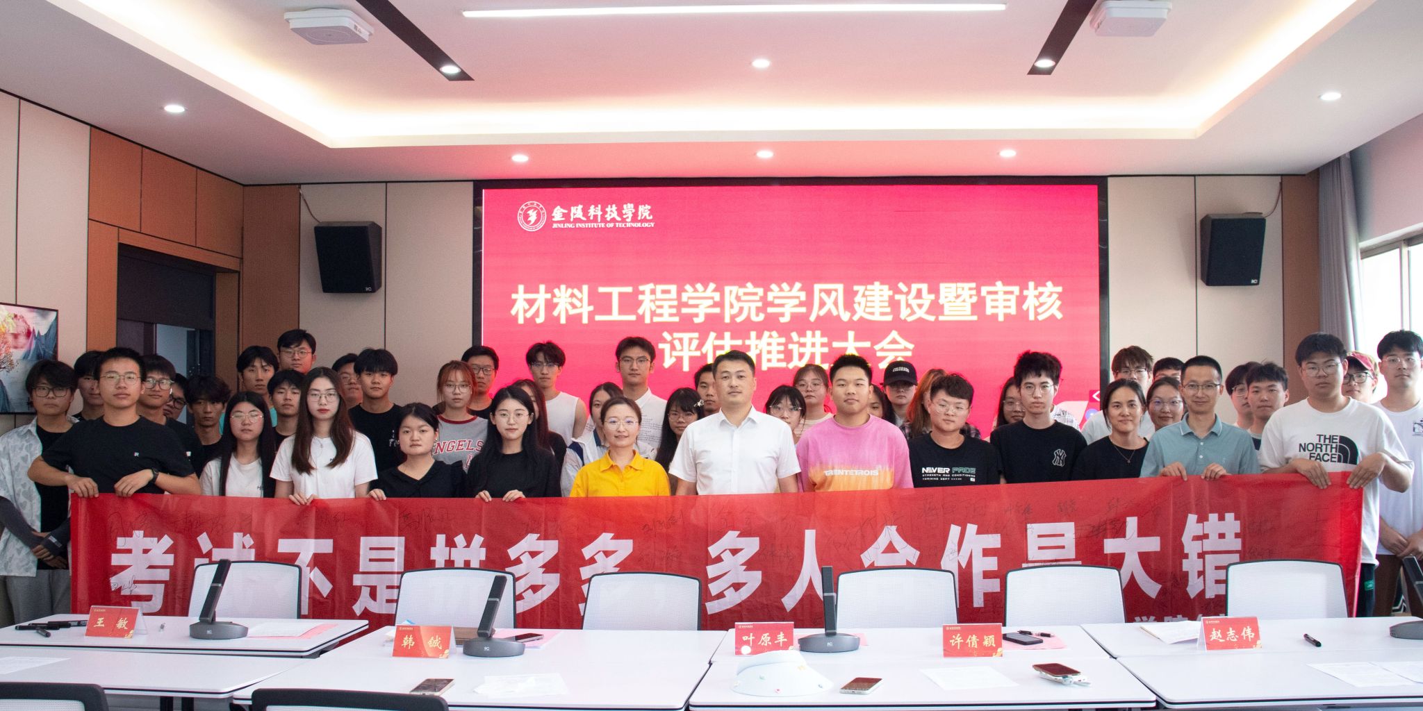 会议伊始,王敏讲解了考风考纪、课堂规范的具体要求,要求同学们树立起高度的规则和纪律意识,自觉抵制违纪行为。接着,22材料科学与工程班王全作“诚信考试”主题发言,呼吁同学们珍惜考试机会,以良好心态发挥真实水平。叶原丰强调学风建设应聚焦四个关键点:第一,端正学习态度,深切认识到诚信考试的严肃性和重要性;第二,分析内在原因,提高对专业课程的理解与认识,以专业赋能学风;第三,学生干部应以身作则,充分发挥学风建设主力军作用;第四,学风建设是审核评估工作的重中之重,全体师生应鼓足干劲、全力以赴,高质量推进教风、学风建设。最后,各班班长和学委在诚信考试横幅上签字,带头做出了诚信考试的承诺。