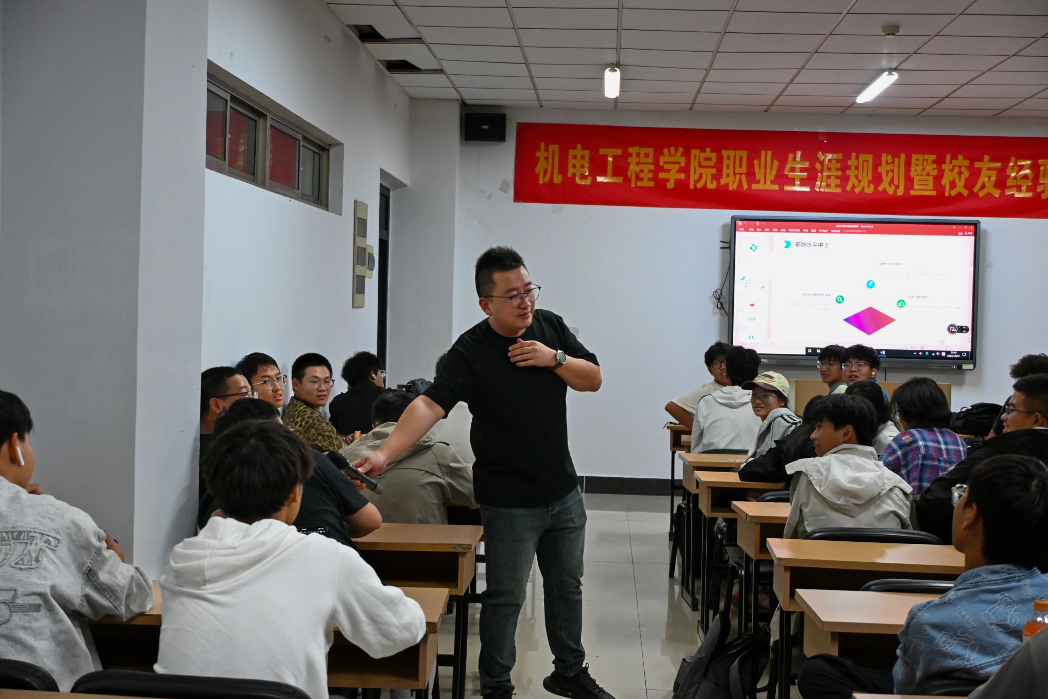李泓昆以“浅谈职业规划”为题,从如何设定明确职业目标、适应职场需求、提升简历和面试技巧等方面展开讲述,并结合个人成长经历,为机电学子分析未来电气专业的发展趋势。他鼓励同学们提高终身学习能力,树立合理的中短期目标,做好充分的行业研究,在技术快速发展和市场竞争加剧的时代实现个人价值和社会贡献。随后,李泓昆分享了职场新人成长路径的建议,提醒大家要保持谦逊学习的态度,勇于接受挑战,以孺子牛、拓荒牛、老黄牛的精神来实现自身价值、创造美好的人生。