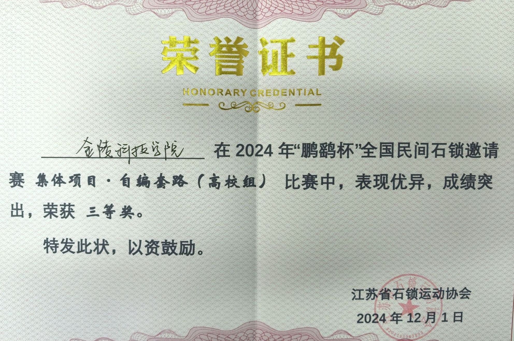 12月1日,由江苏省体育局与江苏省体育总会联合主办的2024年“鹏鹞杯”全国民间石锁邀请赛在南京市体育学院(灵谷寺校区)圆满落幕。beat365正版唯一官网必一动科学院的石锁代表队在此次大赛中表现出色,荣获佳绩。