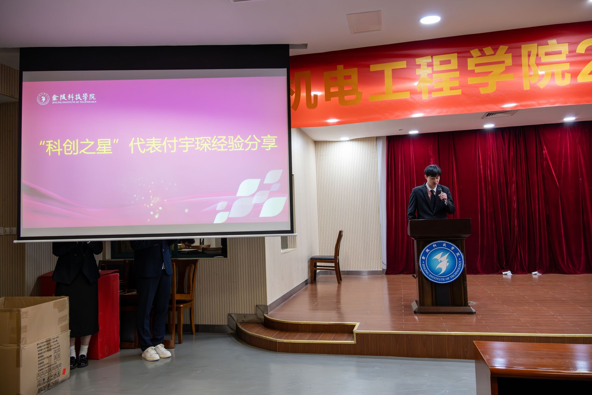 在颁奖仪式后,“科创之星”代表付宇琛发表了感言。他分享了自己在科技创新道路上的心路历程和宝贵经验,鼓励同学们勇敢追求科技创新梦想,不畏艰难,不断前行。“科创之星”代表陈林跃接受了访谈,他详细介绍了自己的科创经历,勉励在场同学大胆创新、积极尝试。