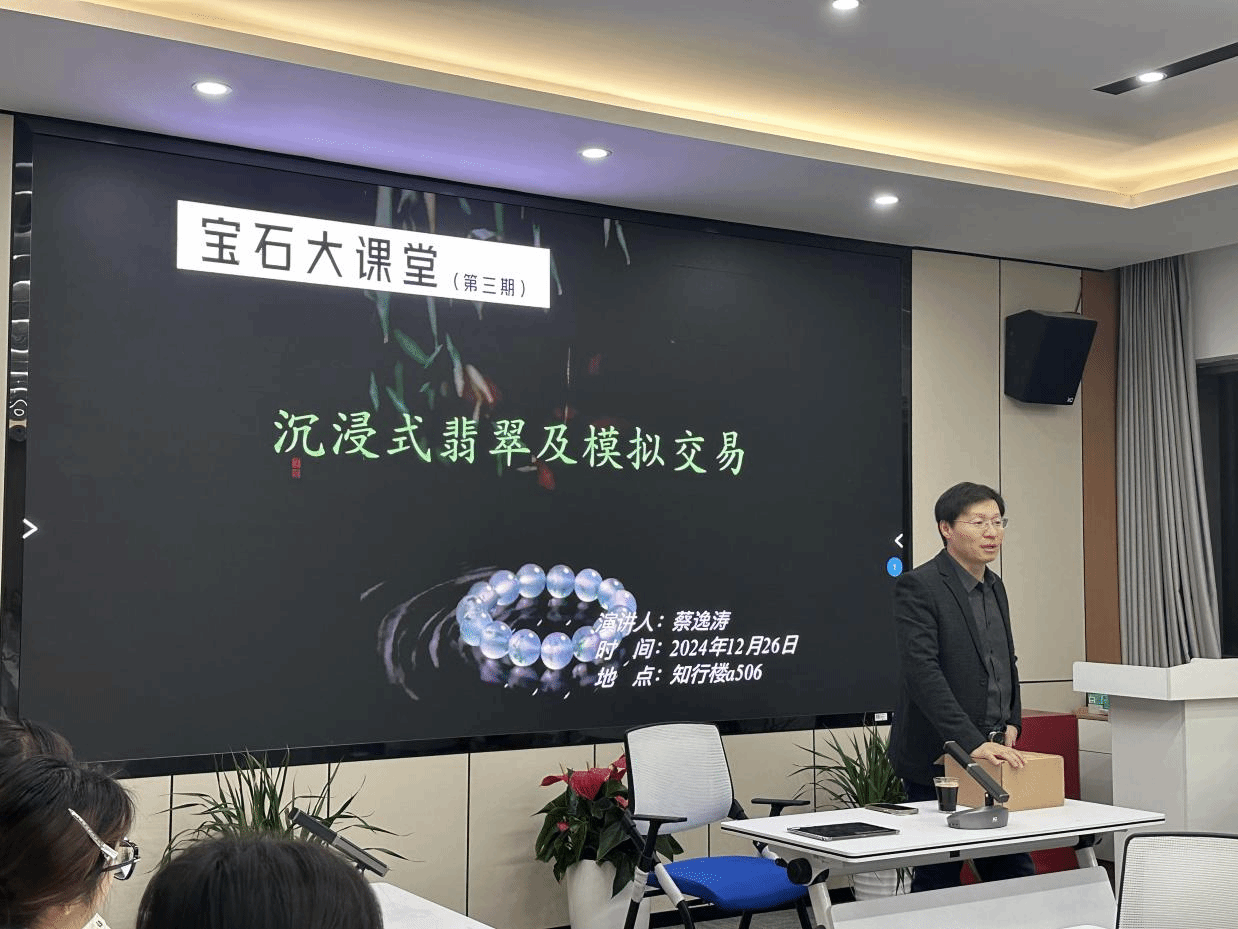 本次活动特别邀请了珠宝系主任蔡逸涛博士亲临现场进行主题演讲,活动内容聚焦翡翠这一备受关注的宝石领域,尤其是翡翠的定价问题。蔡老师凭借其翡翠买手的经验及其丰富的专业背景,深入浅出地剖析了影响翡翠价格的多种因素,并通过生动的案例,帮助同学们更好地理解翡翠的市场动态。同时,蔡老师还展示了自己珍藏的一些翡翠标本,让同学们近距离接触并欣赏这些珍贵的宝石。