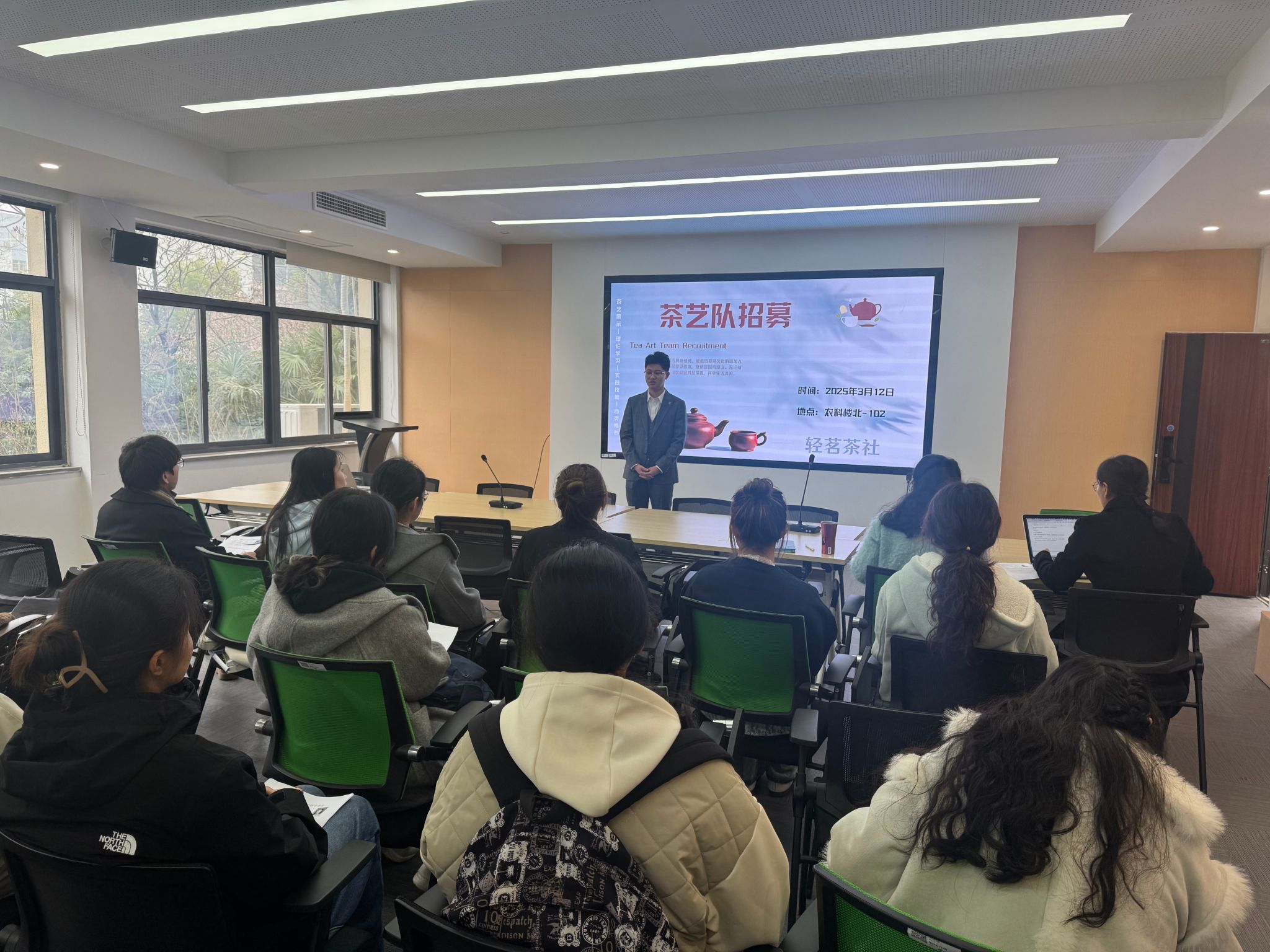 3月12日,园艺园林学院茶艺队“轻茗”茶社茶艺队纳新活动在农科楼北102会议室顺利举行。园艺园林学院茶学副教授董瑞霞、设施系系主任闫娜、24 级辅导员张胜男出席了本次活动,共同见证了茶艺队注入新鲜血液的重要时刻。