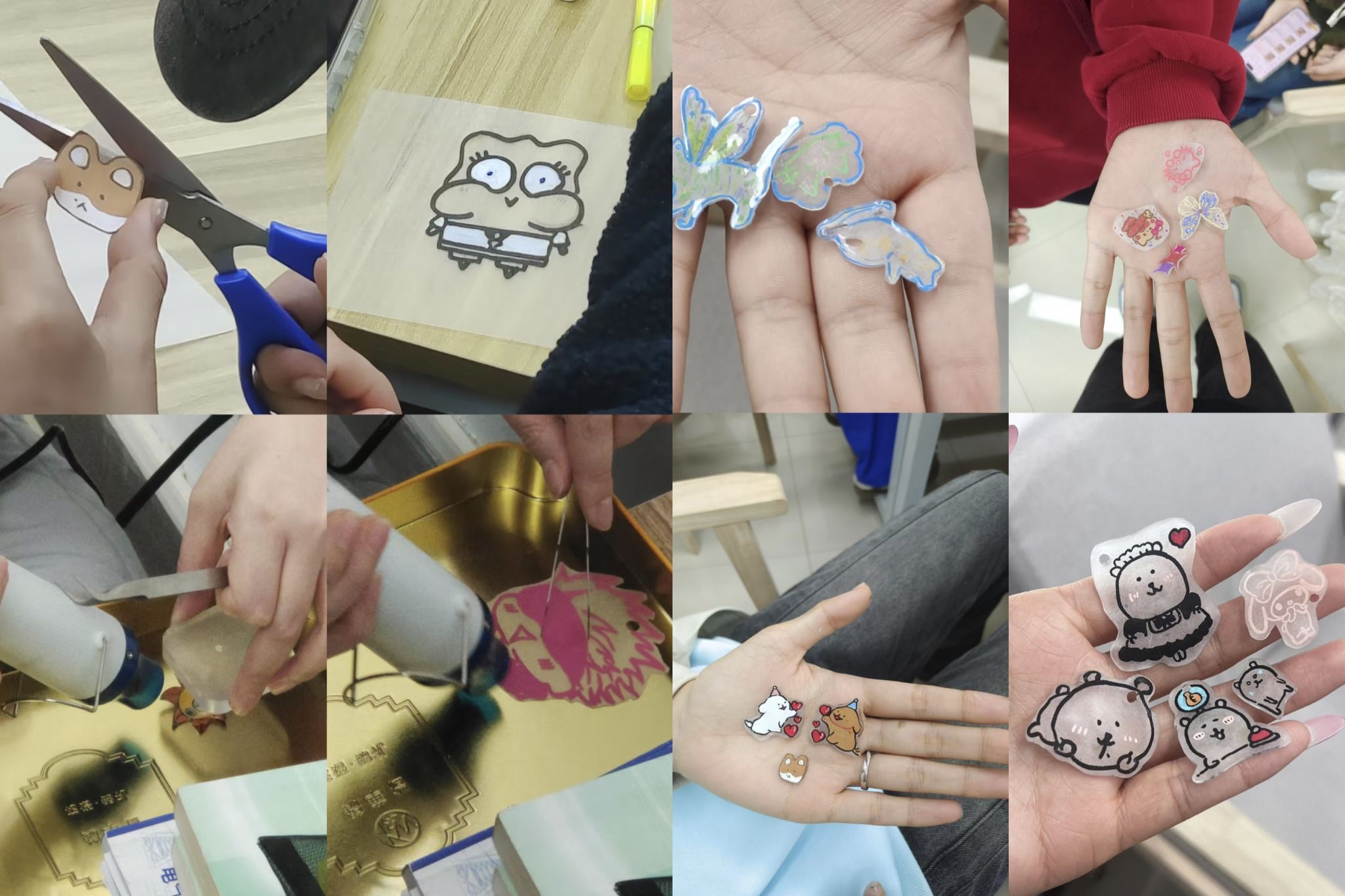 随着彩绘、热缩环节的开始,活动现场气氛愈发热烈。同学们小心翼翼地用热风枪对彩绘好的热缩片进行加热处理,见证着作品在高温下逐渐缩小、变形,最终成为独一无二的挂饰或钥匙扣。这一过程不仅考验了同学们的动手能力,更激发了他们的创造力和耐心,也让大家的情绪随着热缩片的完成而变得轻松愉快。活动现场,学生们的作品风格多样,有的同学以动漫中的角色为原型,绘制出生动可爱的漫画形象;有的则将自己原创的作品巧妙地呈现在热缩片上,展现出细腻的情感表达。参与活动的同学表示,不仅学会了热缩片的制作方法,还能够将自己喜欢的动漫元素融入其中,制作出独一无二的饰品,感觉特别有成就感。