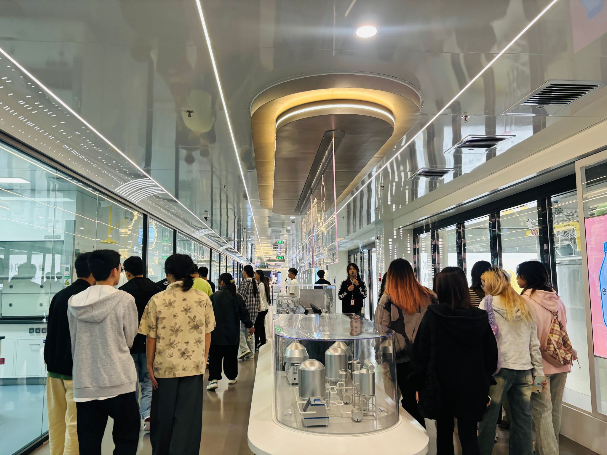 在企业工作人员的引导下,师生首先参观了卫岗乳业的智能化生产车间。透过透明观摩通道,自动化生产线高速运转的场景映入眼帘——从原奶检测、杀菌灌装到包装入库,全流程的数字化管控系统让同学们直观理解“科技赋能传统产业”的内涵。