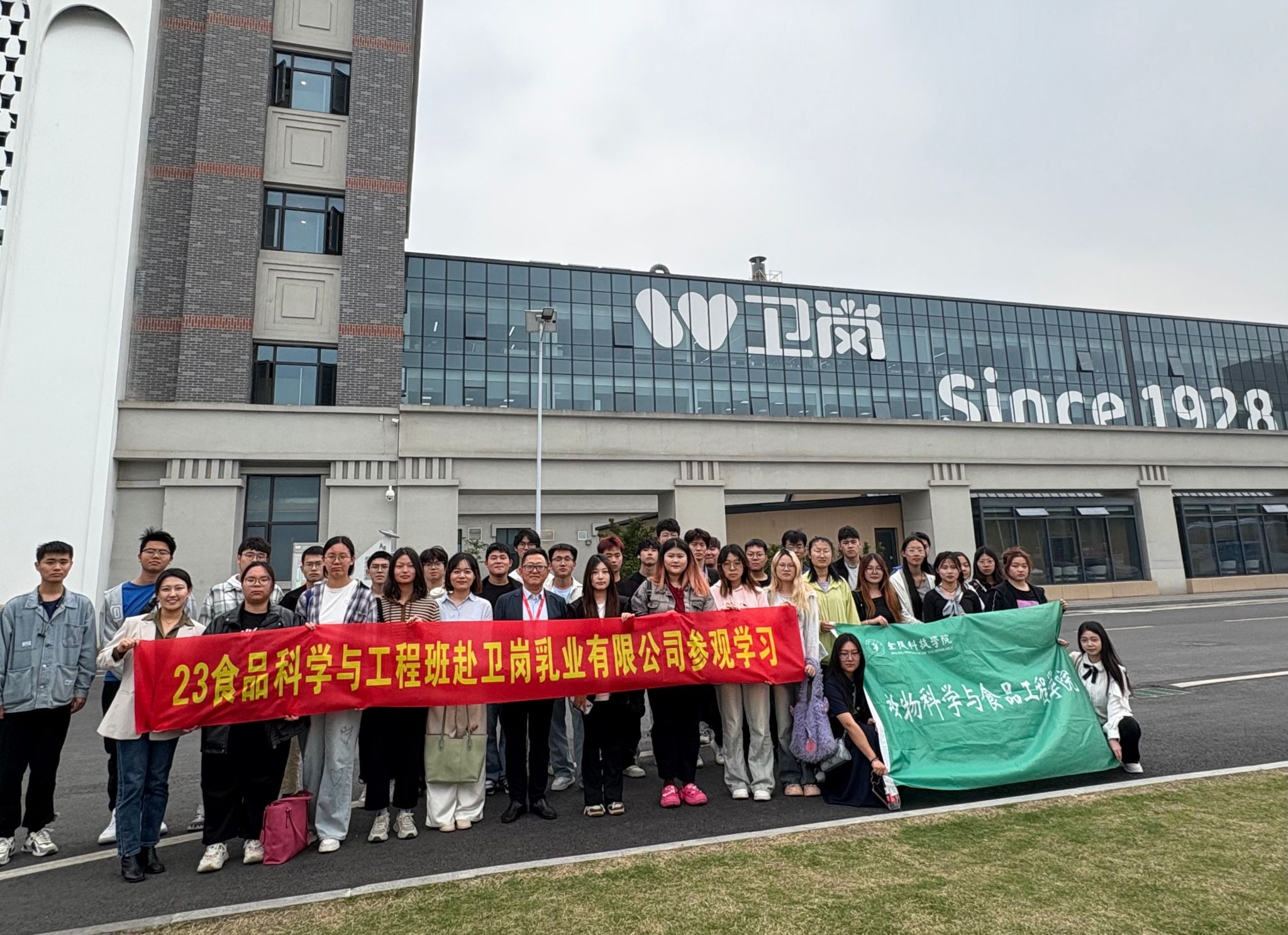 为深化理论知识与实践的结合,拓宽行业视野,增强职业认知,4月22日下午,在企业班主任林志平老师的大力支持下,班主任于利莉、辅导员陈静以及23食品科学与工程班的全体同学师生一行赴卫岗乳业企业开展参观学习活动。通过实地探访乳业生产一线,师生们近距离感受现代乳企的智能化生产流程与品质管控体系,开启了一场生动的“第二课堂”实践之旅。