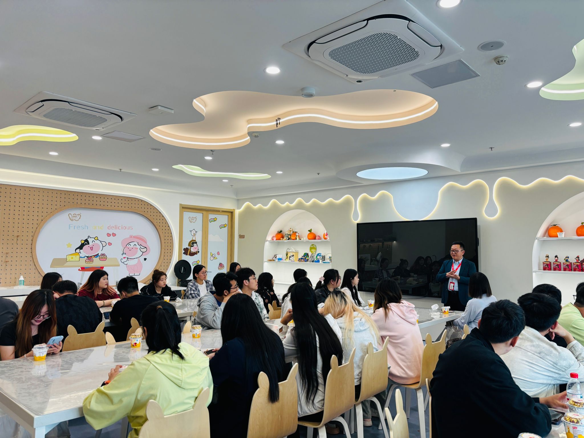 在研学教室中,企业班主任林志平老师结合行业趋势,分享了乳制品创新研发方向(如低温酸奶、咖啡乳品等),并围绕食品专业学生的职业发展路径(技术研发、质量检测、生产管理等)进行了深入解读。