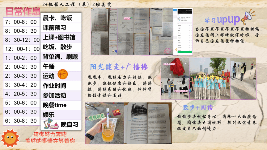 活动设置“作息表制定—打卡挑战—评比表彰”三大环节。参赛学生依据个人目标,规划学业、运动、阅读等项的每日计划,形成个性化作息表。打卡期间,同学们通过指定网络平台实时更新进度,内容涵盖晨读单词、课堂学习、体育锻炼、阅读分享等多元场景,以实际行动践行自律承诺。学院定期推送激励语录,鼓励学生进行交流讨论,营造互助共进的积极氛围。随着21天打卡周期的圆满结束,众多同学在活动中收获颇丰。一位参与者感慨道:“此次活动有效改善了我的拖延症,显著提升了学习效率。”据统计,超过七成的同学完成了21天全勤打卡,众多同学在挑战中实现了自我突破,将自律的种子深植于日常生活的土壤之中。