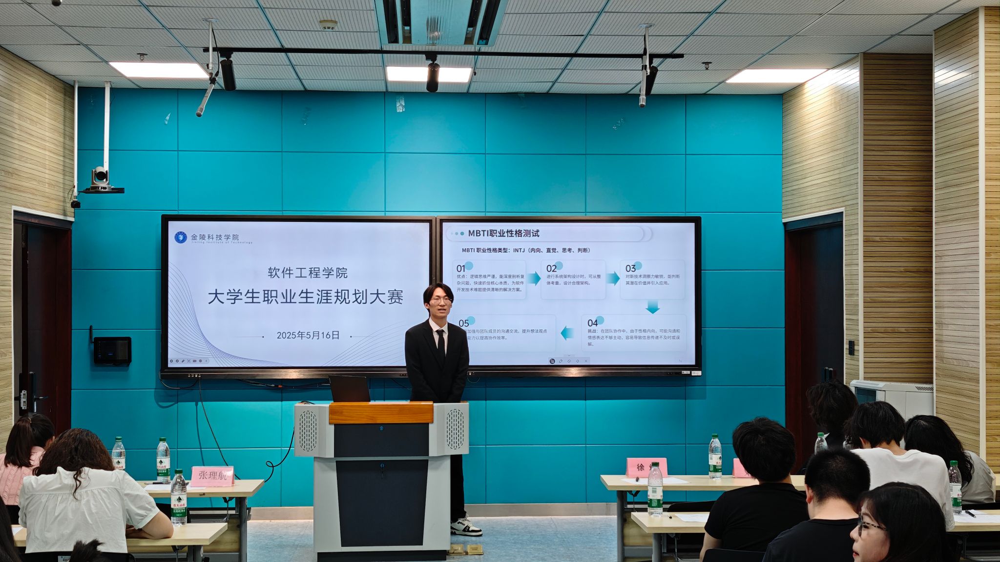 比赛中,11位选手结合专业特色与个人优势,通过PPT展示、现场答辩等形式,从自我认知、职业目标、实施路径等方面进行了精彩阐述。有的选手聚焦人工智能领域,提出成为算法工程师的阶段性规划;有的同学立足创新创业,分享了打造科技型企业的愿景。评委老师们从可行性、行业趋势、个人适配度等角度进行提问与点评,为选手提供了宝贵建议。徐斌副书记在总结发言中充分肯定了参赛选手的积极态度与规划能力,希望同学们以赛促学,在实践中不断调整方向,实现职业理想。张理航老师则鼓励学生将规划转化为行动,充分利用学院资源提升综合素养。